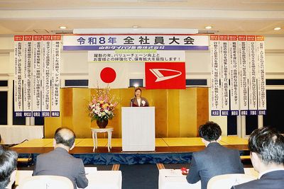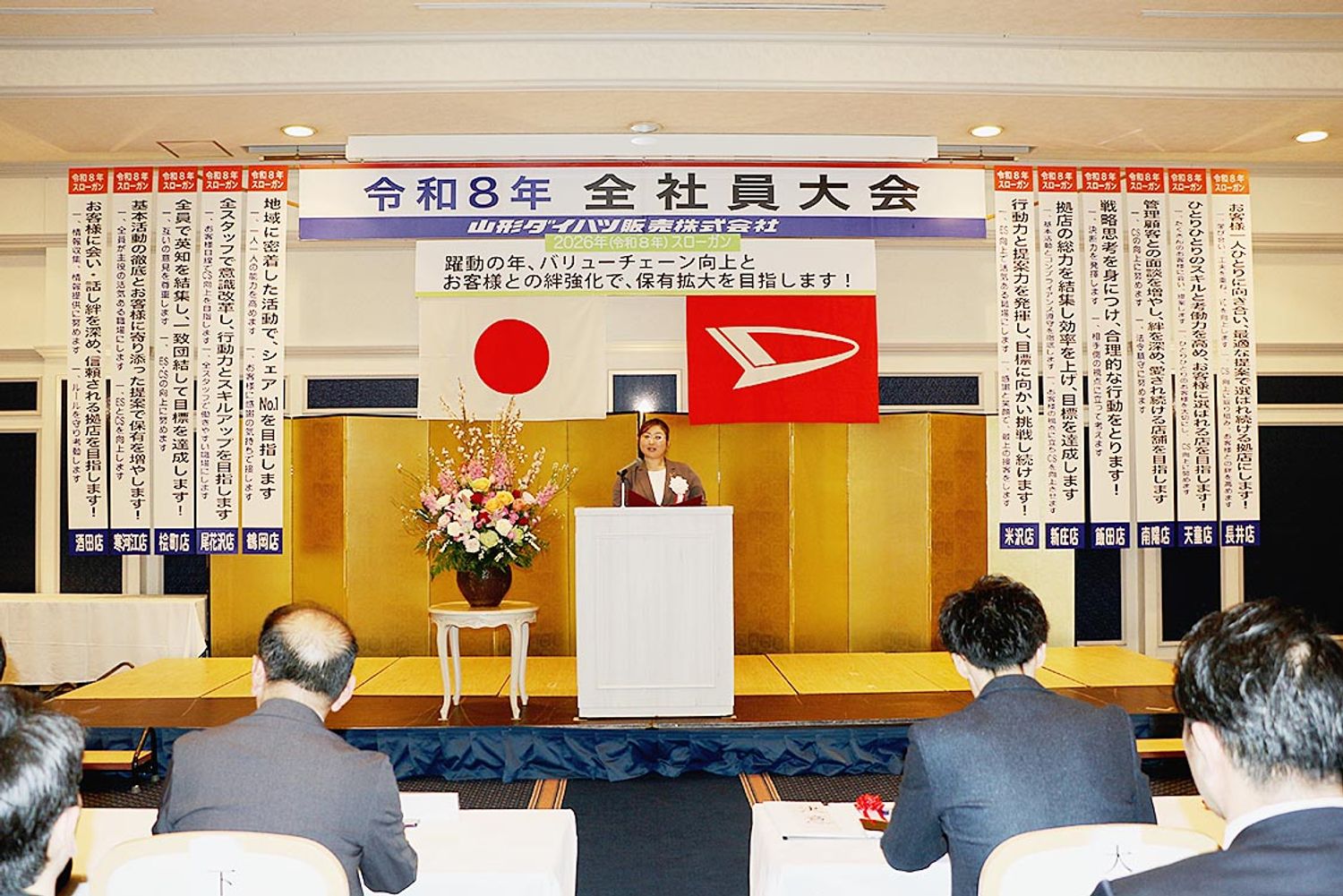【山形】山形ダイハツ(鈴木恵社長、山形県山形市)は、天童市で「令和8年全社員大会」を開催した。役員と社員合わせて220人が出席し、2026年の経営方針を共有するとともに、25年に優秀な成績を収めた社員と拠店を表彰した。 あいさつで鈴木社長...