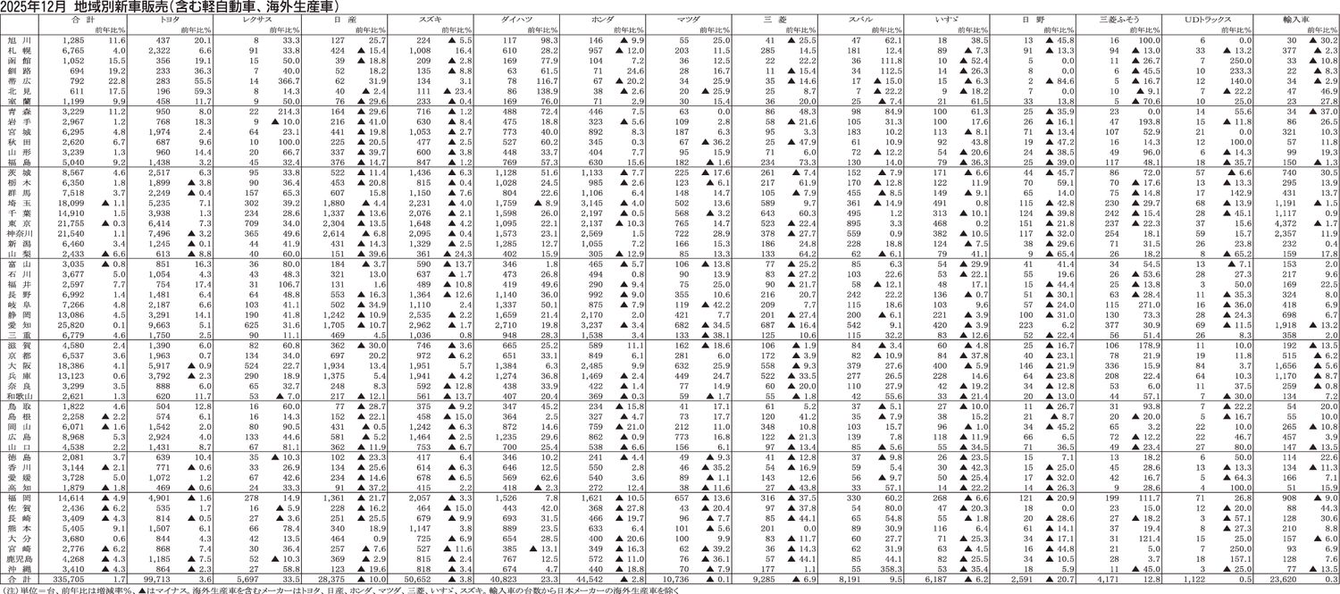 〈2025年12月 地域別新車販売(含む軽自動車、海外生産車)〉