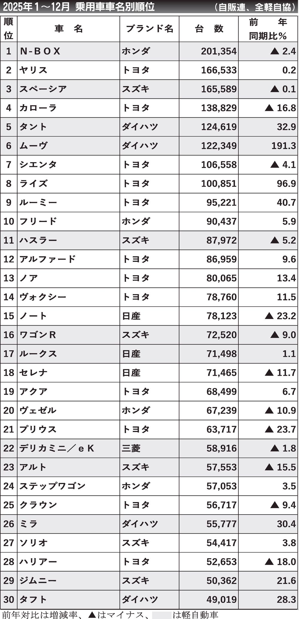 2025年の車名別国内新車販売台数(登録車と軽自動車の合計)は、ホンダ「N-BOX(エヌボックス)」が4年連続で首位だった。新型車効果が薄れ、販売台数は減少(前年比2.4%減)したが、根強いブランド力に加え、需要を喚起する販売施策が奏功し...
