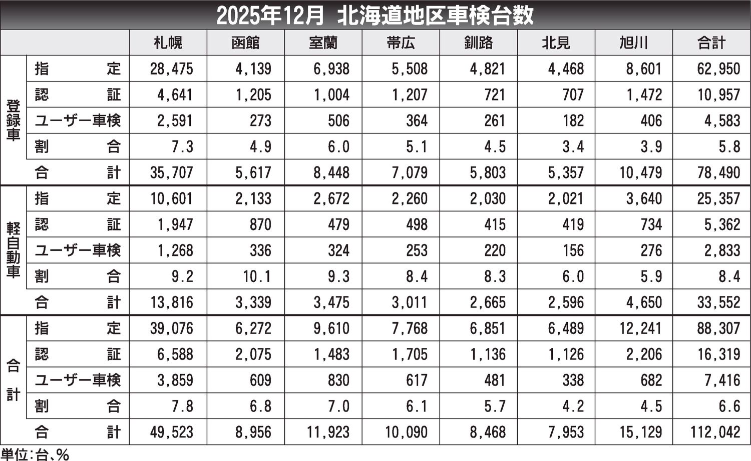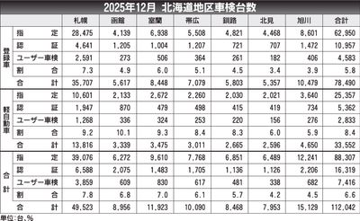 北海道2025年12月の継続検査(車検)台数(軽自動車を含む)は、前年同月比7.2%増の11万2042台で、2カ月ぶりに前年を上回った。登録車は同4.5%増の7万8490台、軽自動車は同14.3%増の3万3552台で、いずれも2カ月ぶりに...
