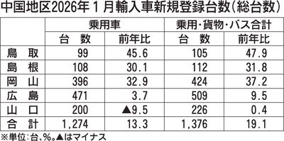 日本自動車輸入組合(JAIA)の発表によると、1月の中国地区輸入車新規登録台数(外国メーカー車と日本メーカー車)は、前年同月比19.1%増の1376台だった。中国5県全県で前年を上回り、2カ月連続で増加した。車種別では乗用車が同13.3%...