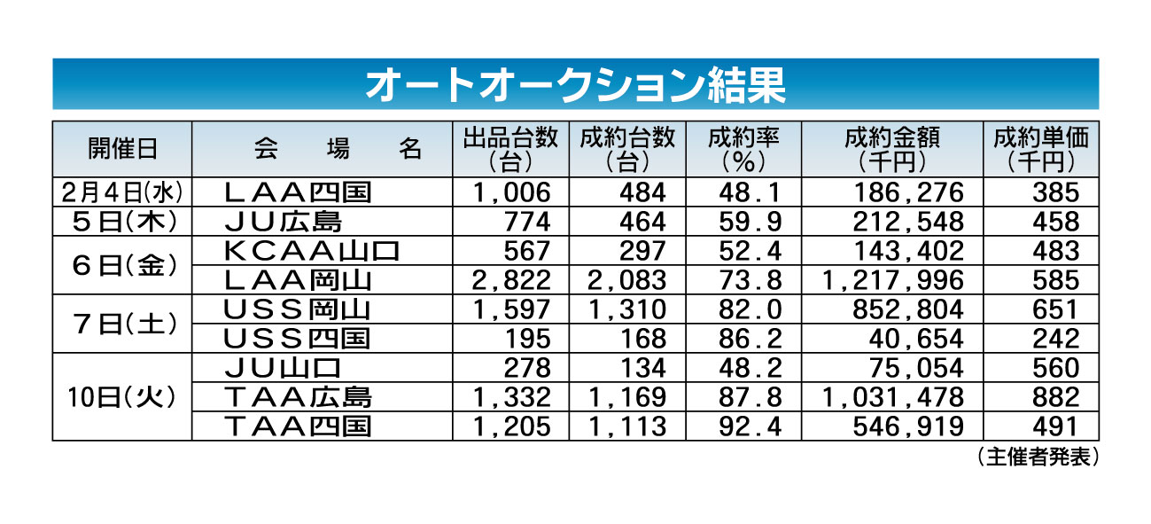 〈オートオークション結果〉中・四国地区 2026/2/4~10