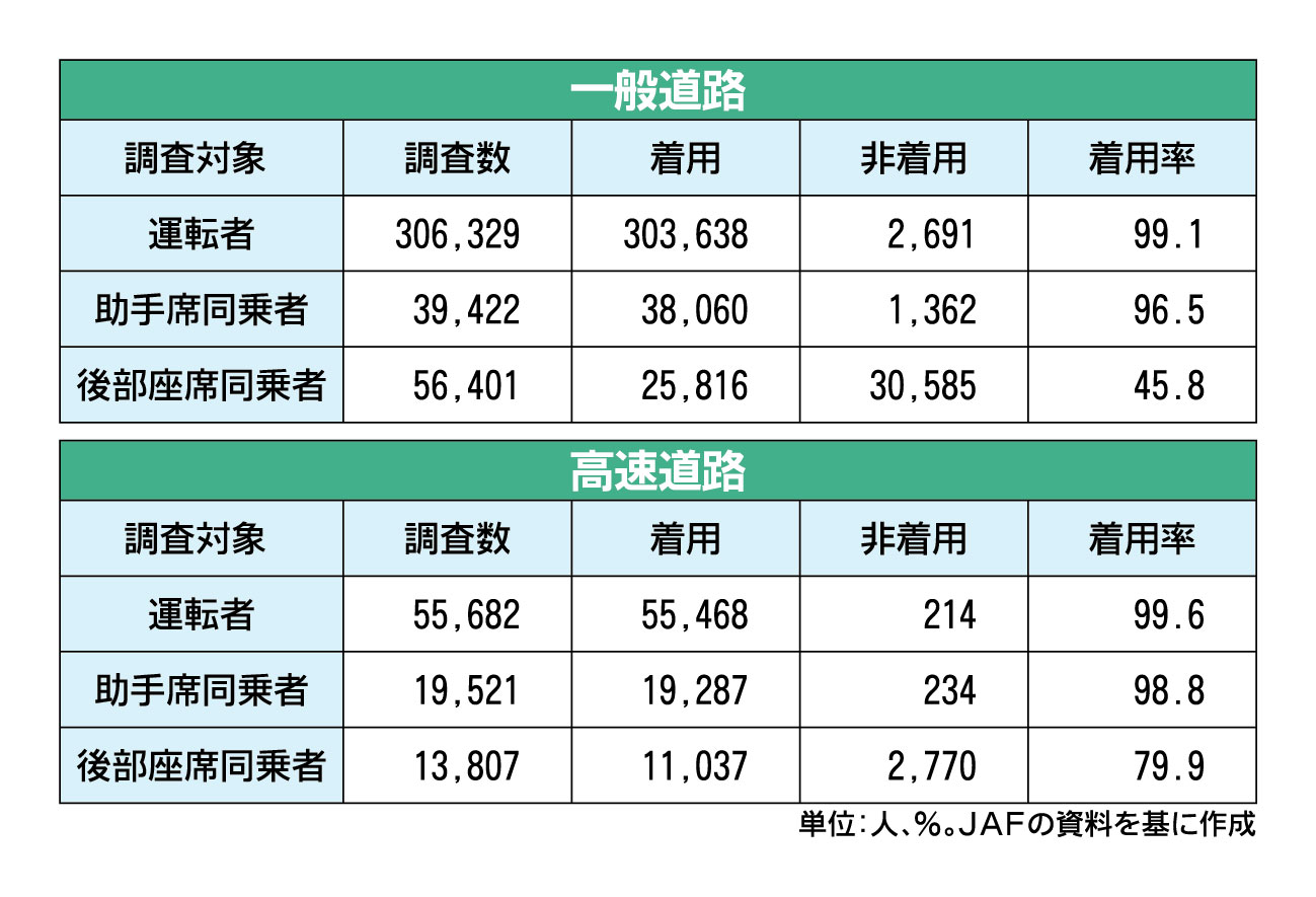一方、早めに義務化された前席での着用率は高い。運転席と助手席は高速道路で、それぞれ前年と同じ99.6%、98.8%だった。一般道路は同0.1ポイント減の99.1%、同0.3ポイント減の96.5%だった。ただ、100%に至っていないばかりか、助手席に関してはマイナスとなっている。改めてシートベルトの重要性を啓発する活動が必要となりそうだ。