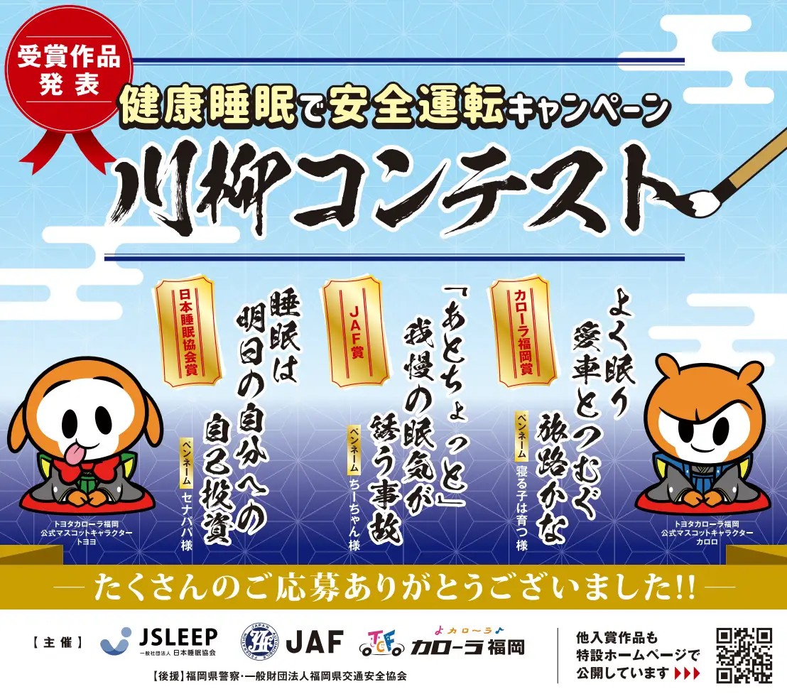 日本自動車連盟(JAF)福岡支部(佐竹伸一支部長)が初開催した「健康睡眠で安全運転キャンペーン川柳コンテスト」の受賞作品が決まった。同コンテストは、睡眠や安全運転に関する川柳でこれらの重要性を認識し、ドライバーの交通安全意識の向上を図るのが...