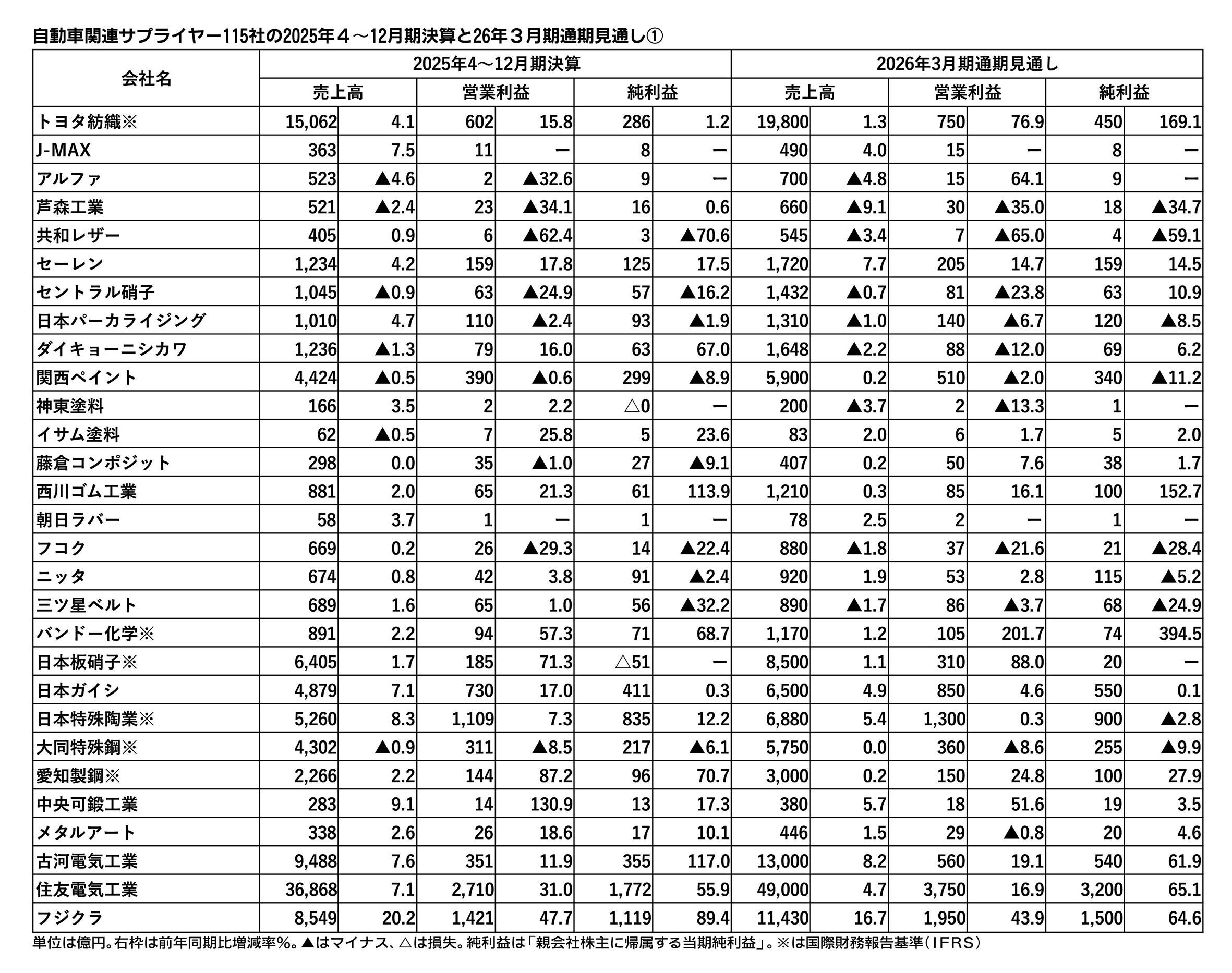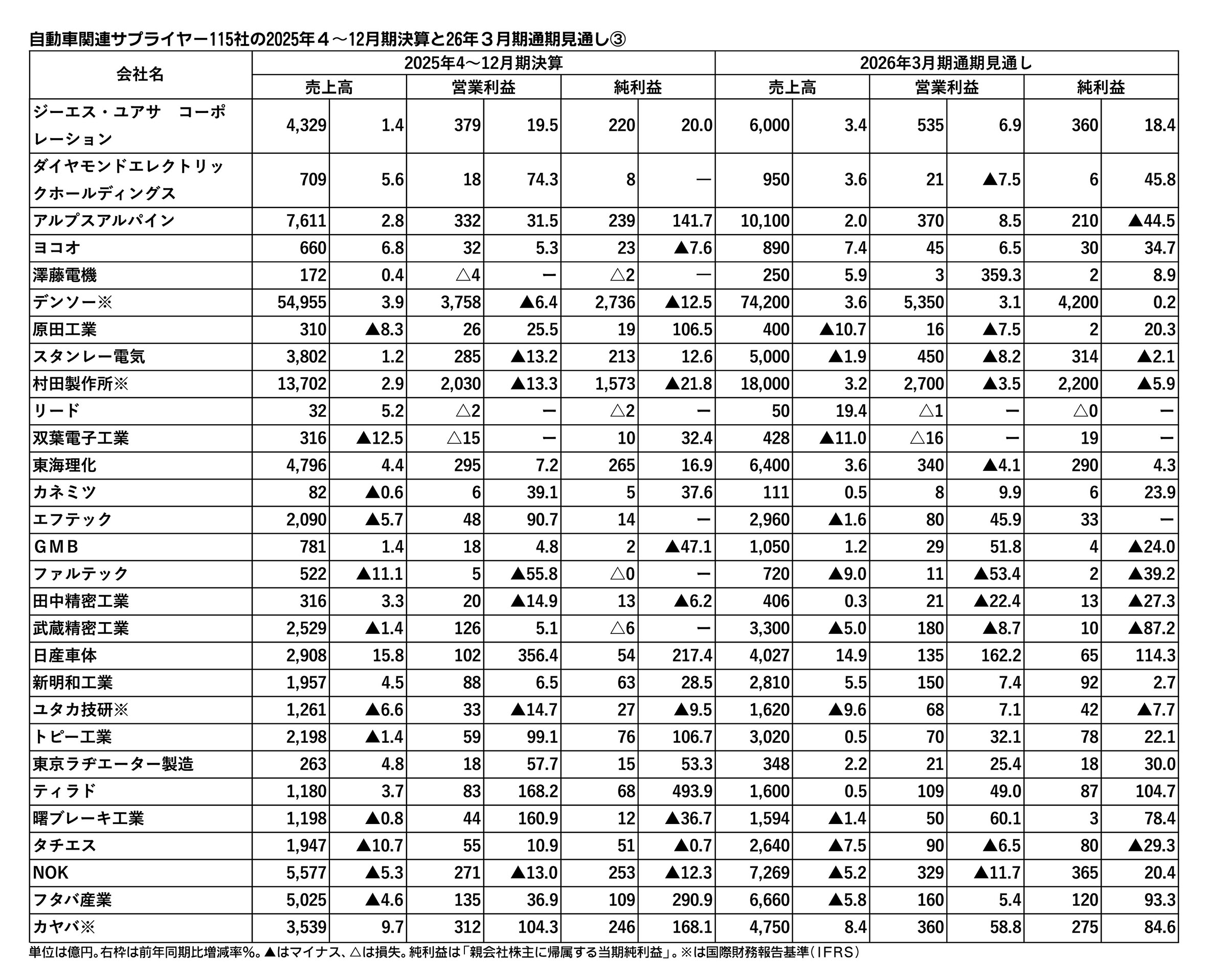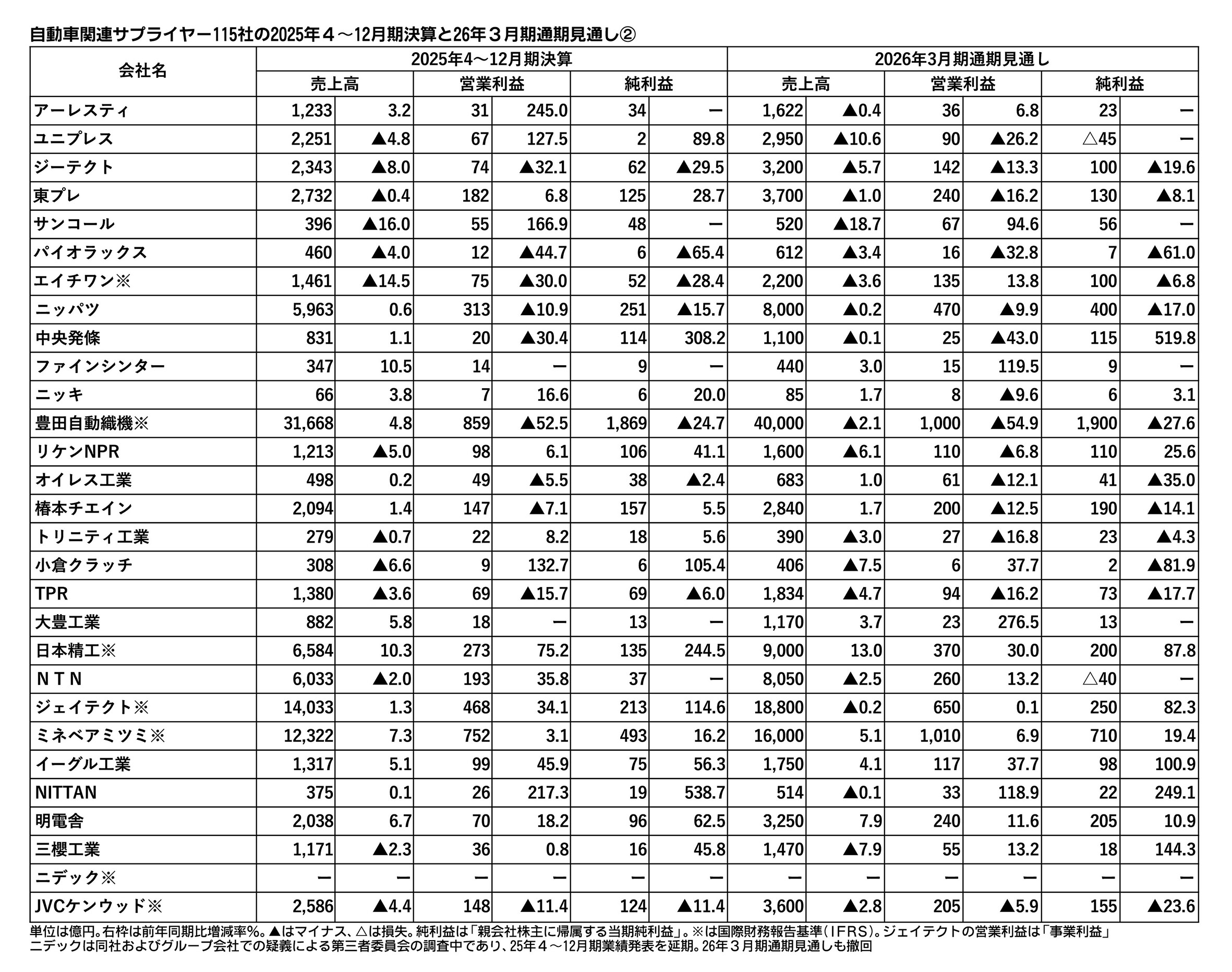日刊自動車新聞が集計した主な上場部品メーカー115社の2025年4~12月期決算は6割強が増収となった。営業増益となった企業も6割強で、全体的には底堅さが窺える。ただ、トヨタ自動車系の好調に対して、日産自動車やホンダなどを主要取引先とする...