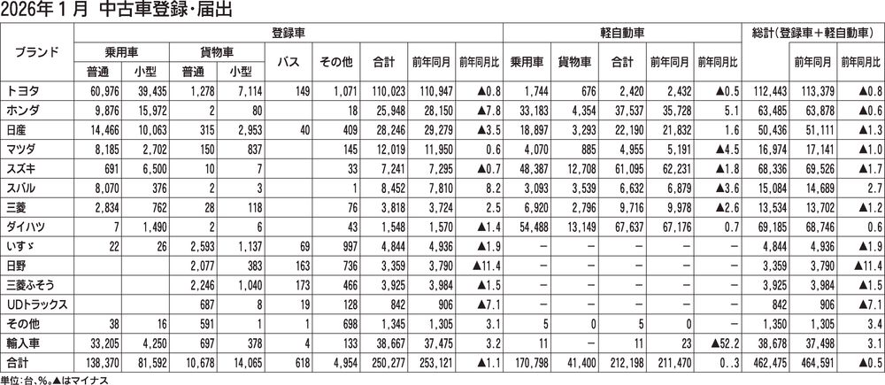 〈2026年1月 中古車登録・届出〉