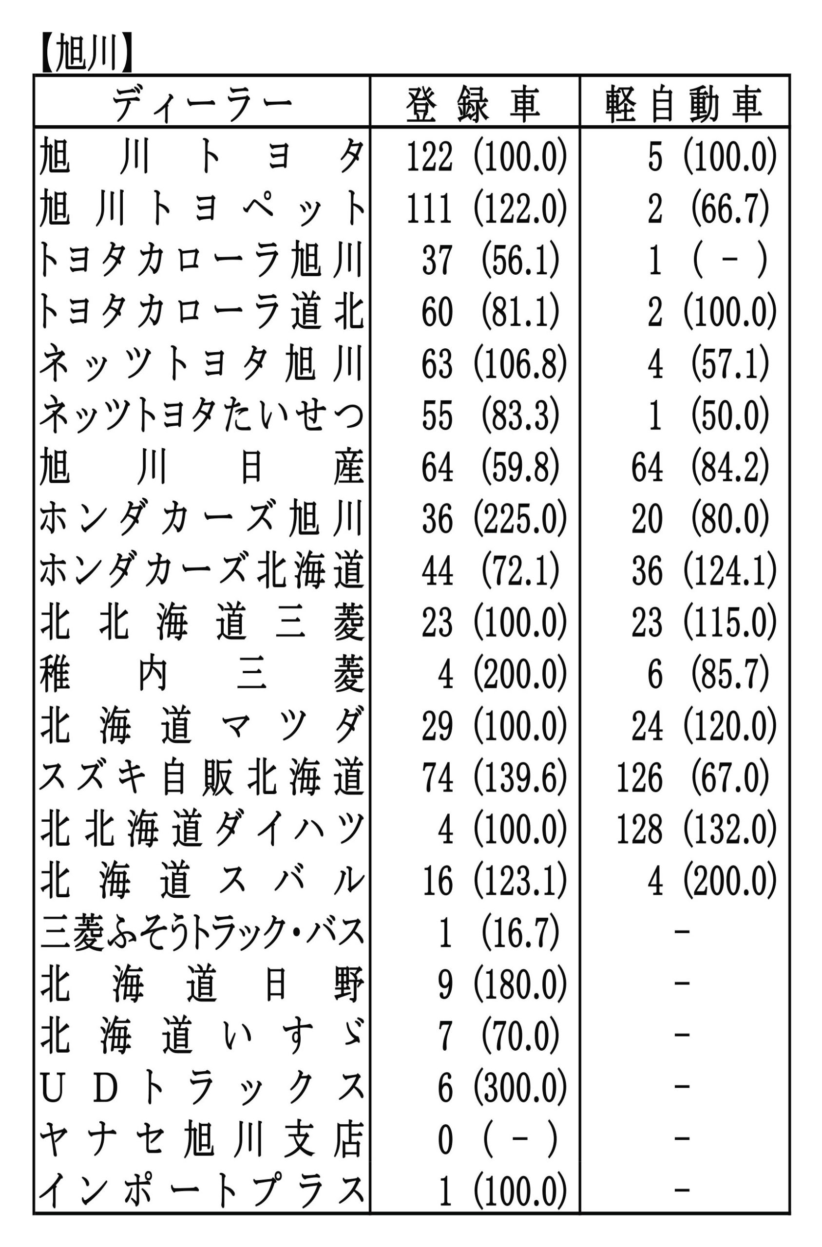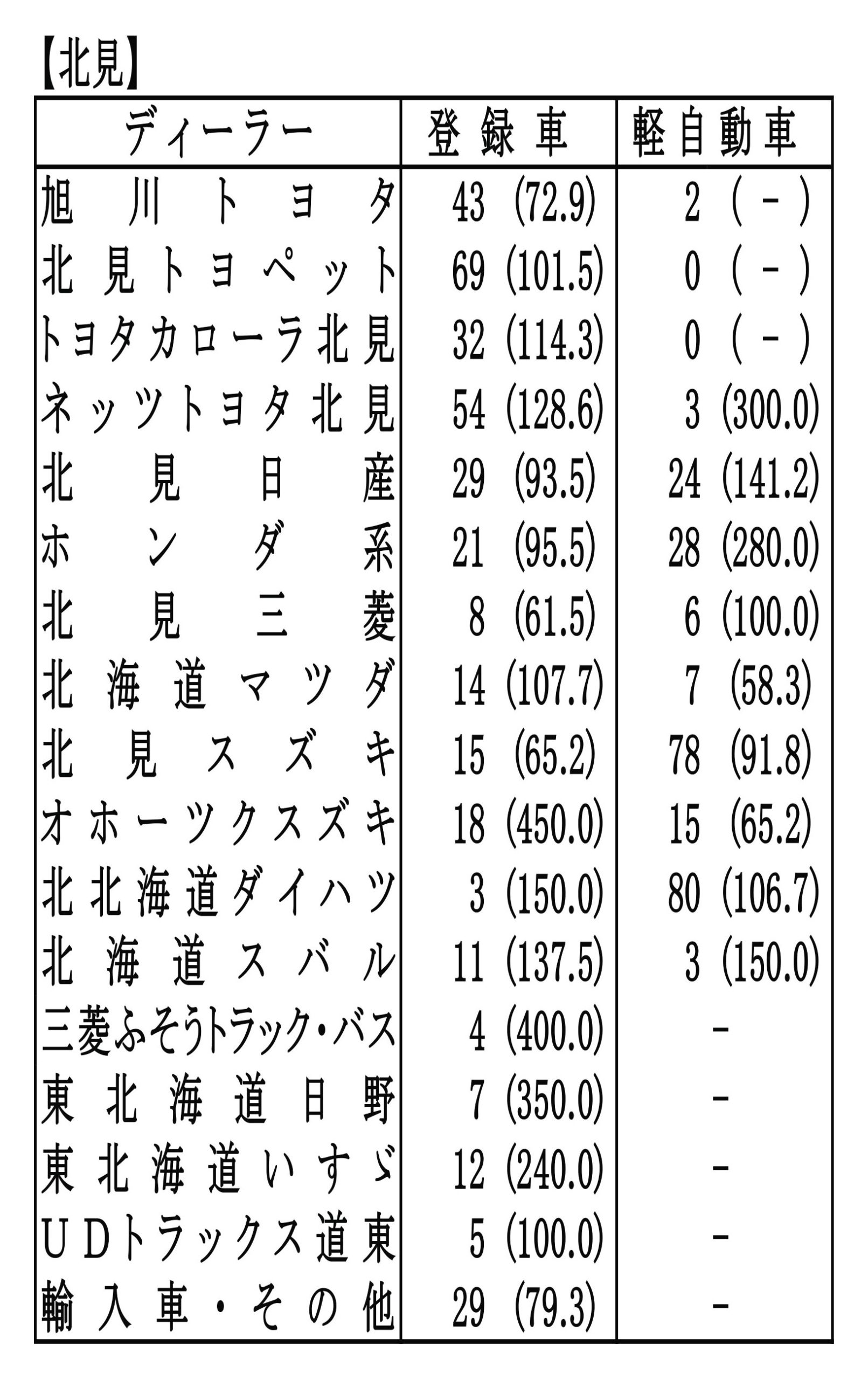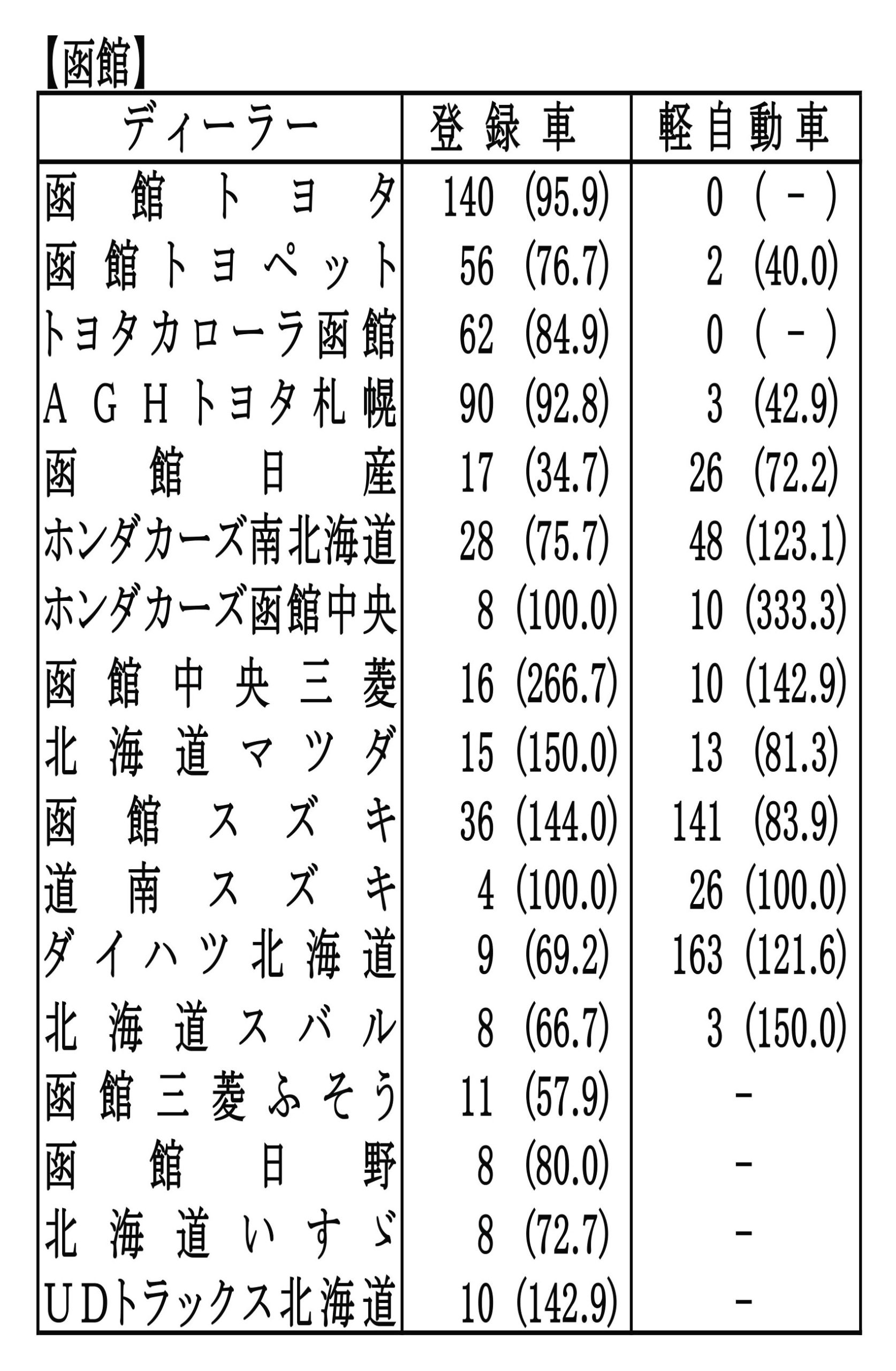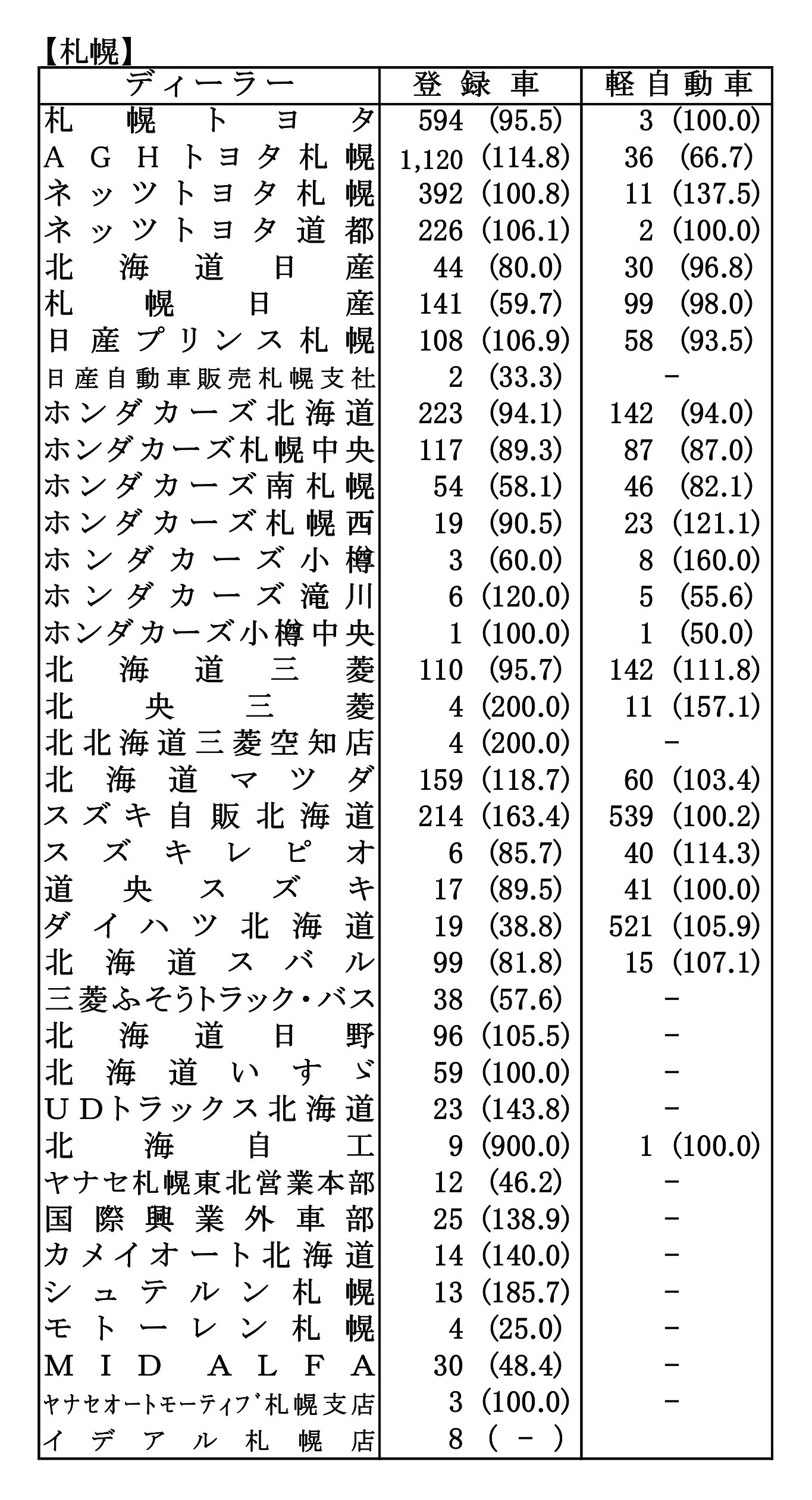 〈2026年1月度全道管内別ディーラー別新車登録・届け出台数(カッコ内は前年同月比)〉※札幌管内ホンダ系・スズキ系の登録台数は自販連正会員分