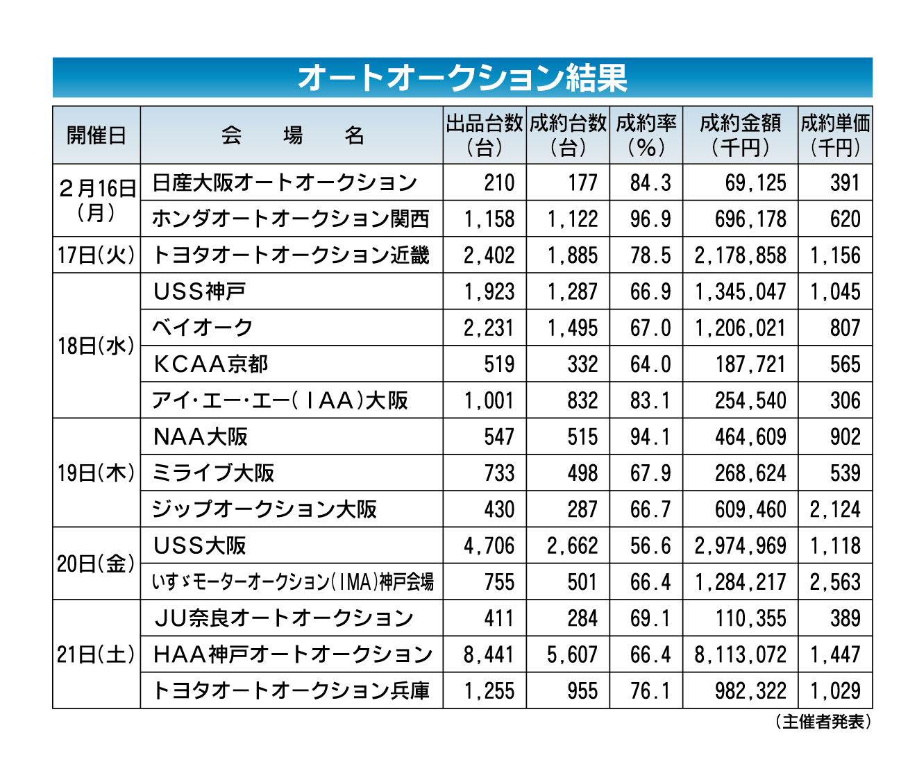 〈オートオークション結果〉 近畿地区 2026/2/16~21