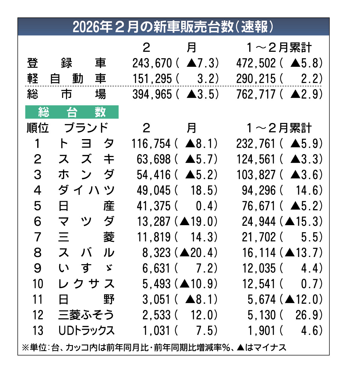 2026年2月の国内新車販売、2カ月連続減少 トヨタとホンダは長納期化 日産は新型ルークスで17カ月ぶりプラス