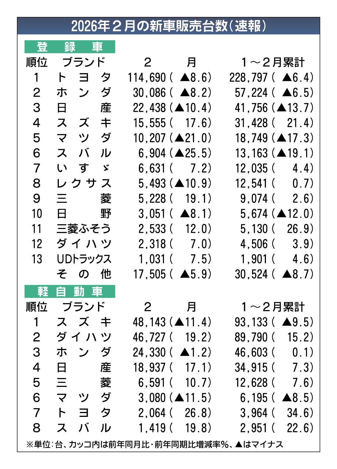日産、ダイハツ工業、三菱自動車は増加した。日産は24年10月から減少が続いていたが、26年2月は同0.4%増の4万1375台とわずかながらプラスに転じた。登録車は同10.4%減の2万2438台と苦しい状況に変わりはないが、軽は新型「ルークス」の効果で同17.1%増の1万8937台と伸びた。もっとも、登録・届け出台数自体は24年2月の4万7575台と比べて約14%少ない水準で、本格的な回復には至っていない。