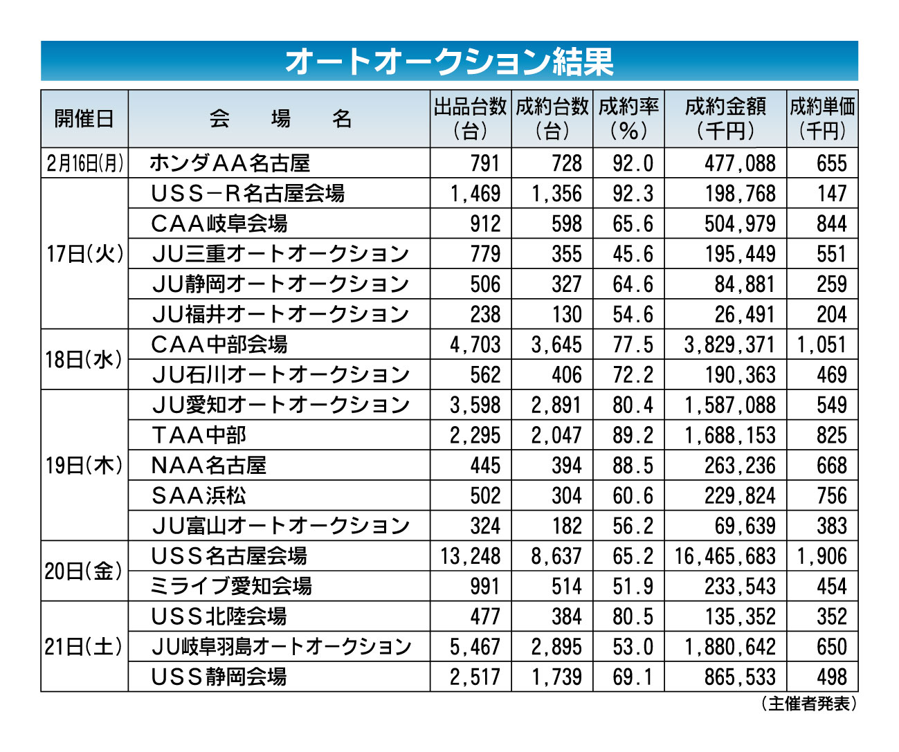 〈オートオークション結果〉中部地区 2026/2/16~21