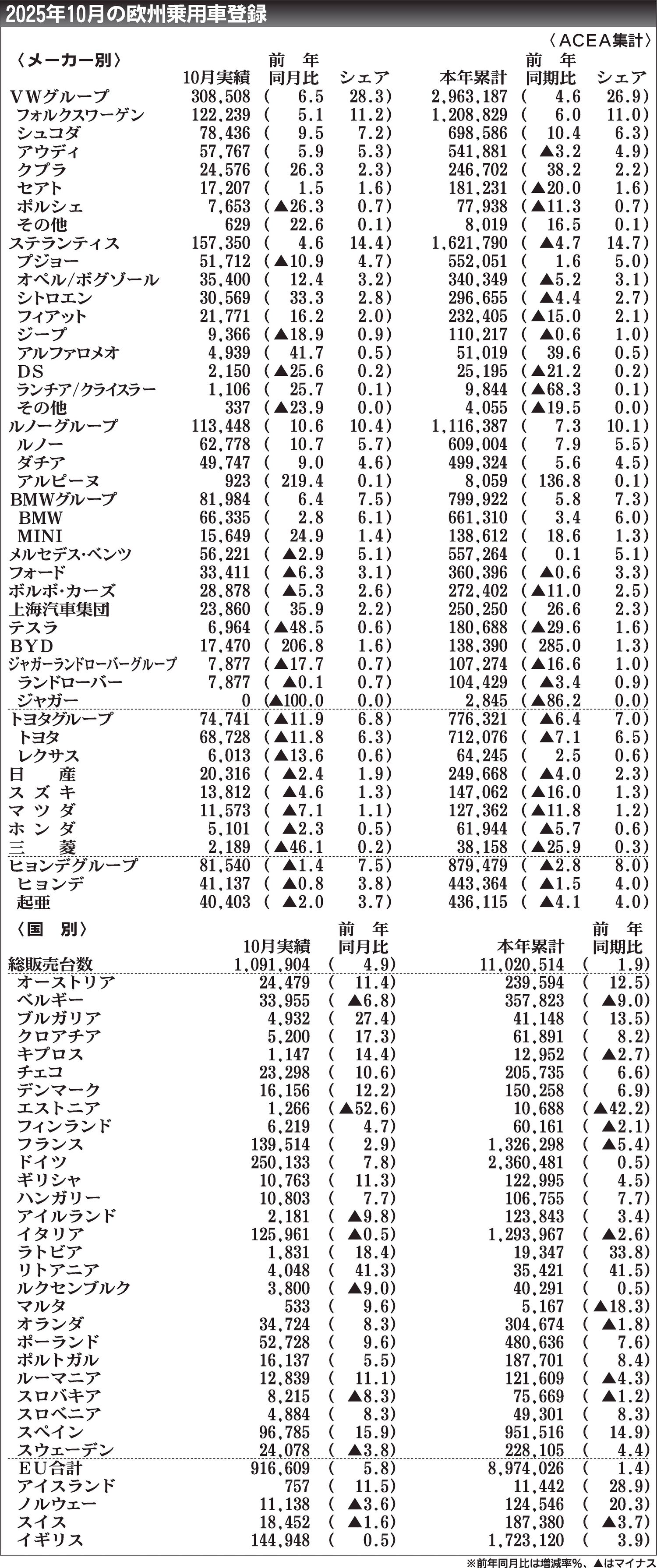 欧州自動車工業会(ACEA)がまとめた2025年10月の新車販売台数(主要31カ国、乗用車)は、前年同月比4.9%増の109万1904台と4カ月連続で増加した。電気自動車(EV)が同32.9%増、プラグインハイブリッド車が同40.2%増と...