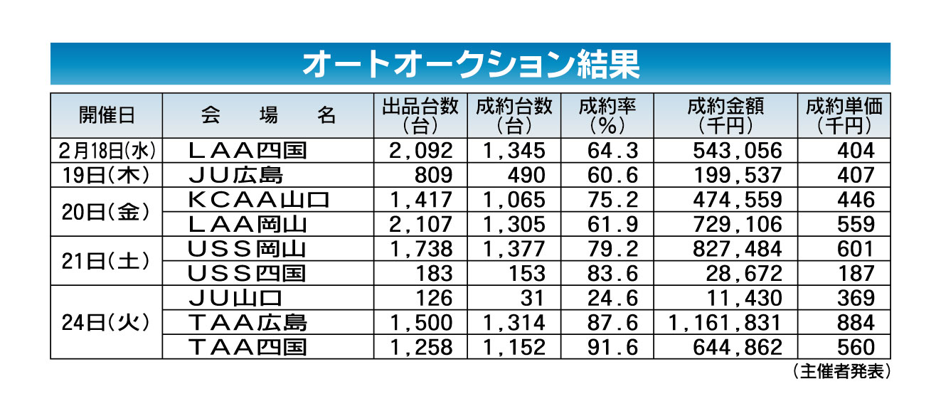 〈オートオークション結果〉中・四国地区 2026/2/18~24