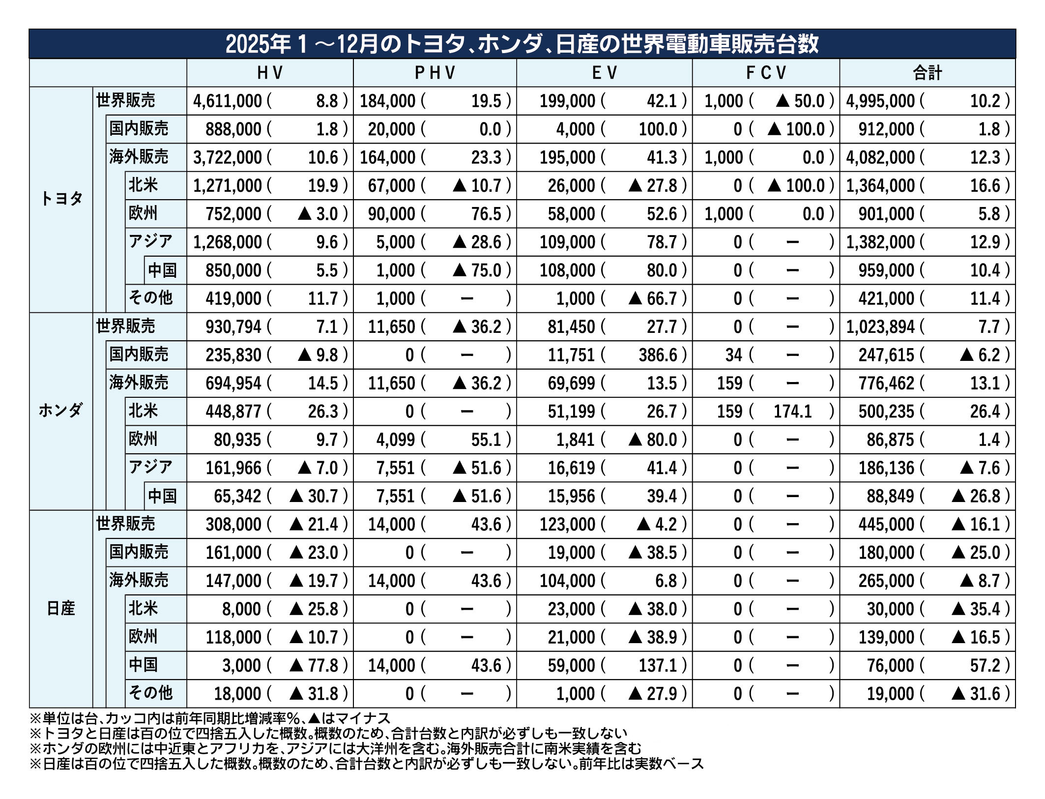 日本メーカー3社の2025年世界電動車販売、HV快走もメーカー・地域で明暗