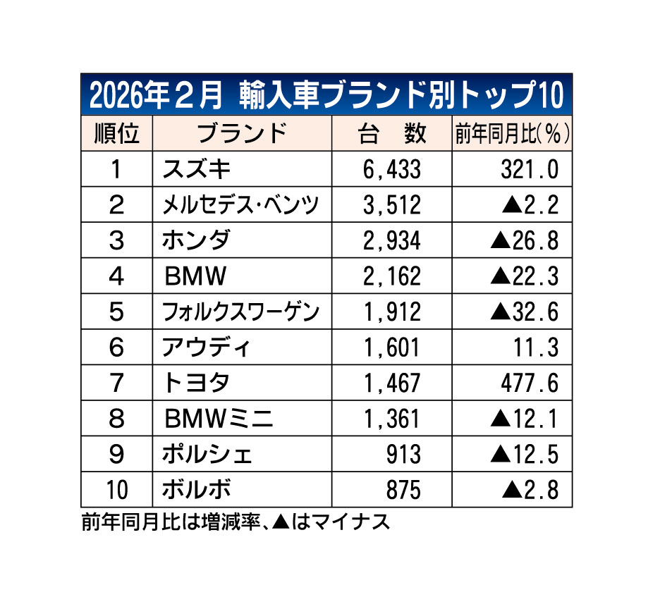 2026年2月の外国メーカー車販売、2カ月連続マイナス 日本メーカー車の好調で輸入車全体はプラス