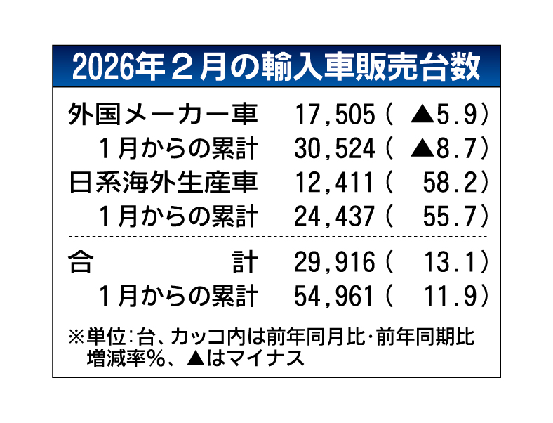 日本自動車輸入組合(JAIA、ゲルティンガー剛理事長)が3月5日発表した2026年2月の外国メーカー車新規登録台数は、前年同月比5.9%減の1万7505台となり、2カ月連続で減少した。登録車全体に占める割合は、7.2%だった。輸入電気自動車(EV)の販売台数は、同43.0%増の2675台となり2カ月連続で増加した。外国メーカー車に占めるEVシェアは、同5.2ポイント増の15.3%となった。