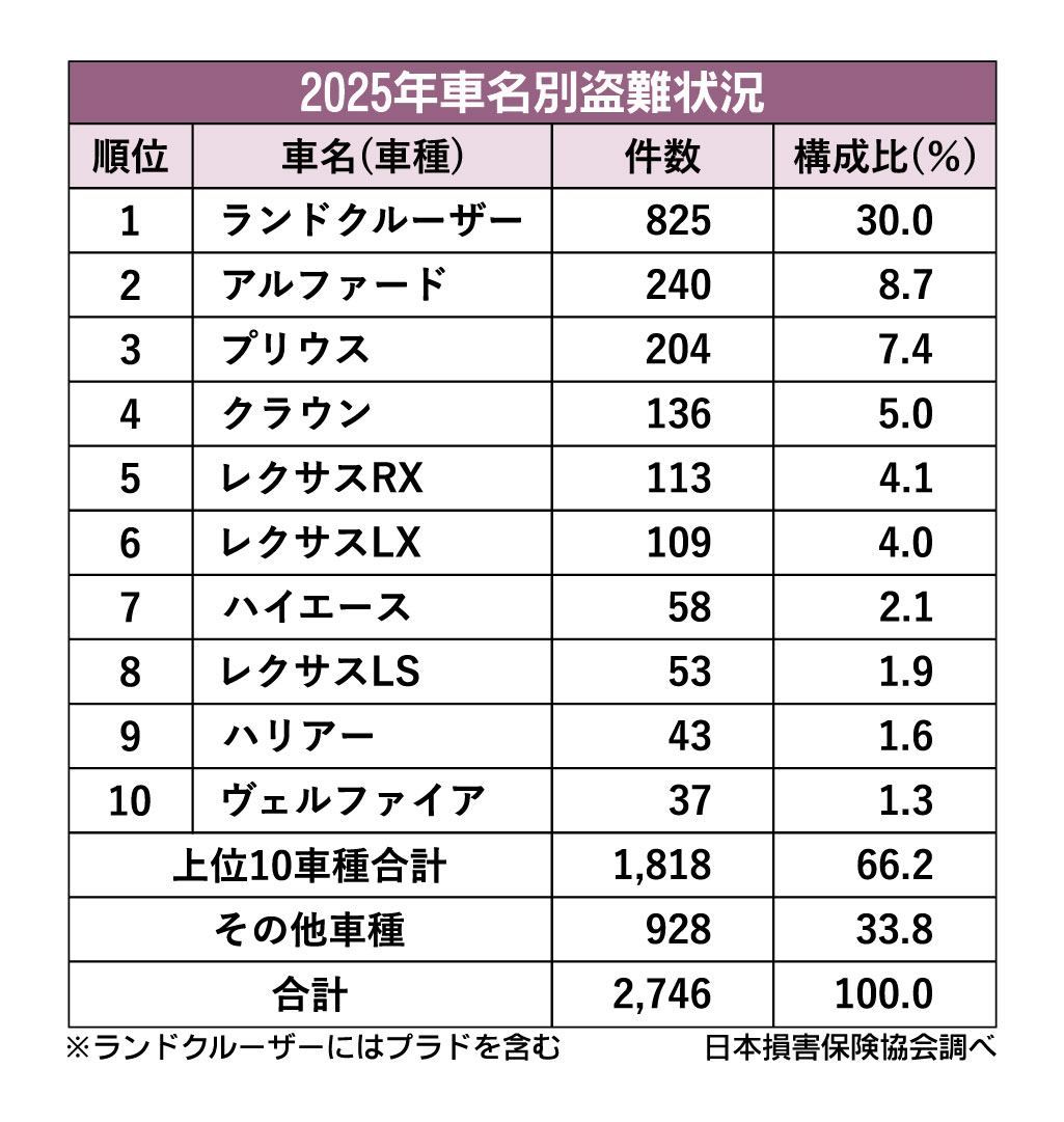 日本損害保険協会(損保協、舩曵真一郎会長=三井住友海上火災保険社長)が3月4日発表した「第27回自動車盗難事故実態調査結果」によると、2025年に最も被害があったのはトヨタ自動車のSUV「ランドクルーザー」(盗難件数=825件)だった。損保各社が保険金を支払った事案で、5年連続のワーストワンとなった。