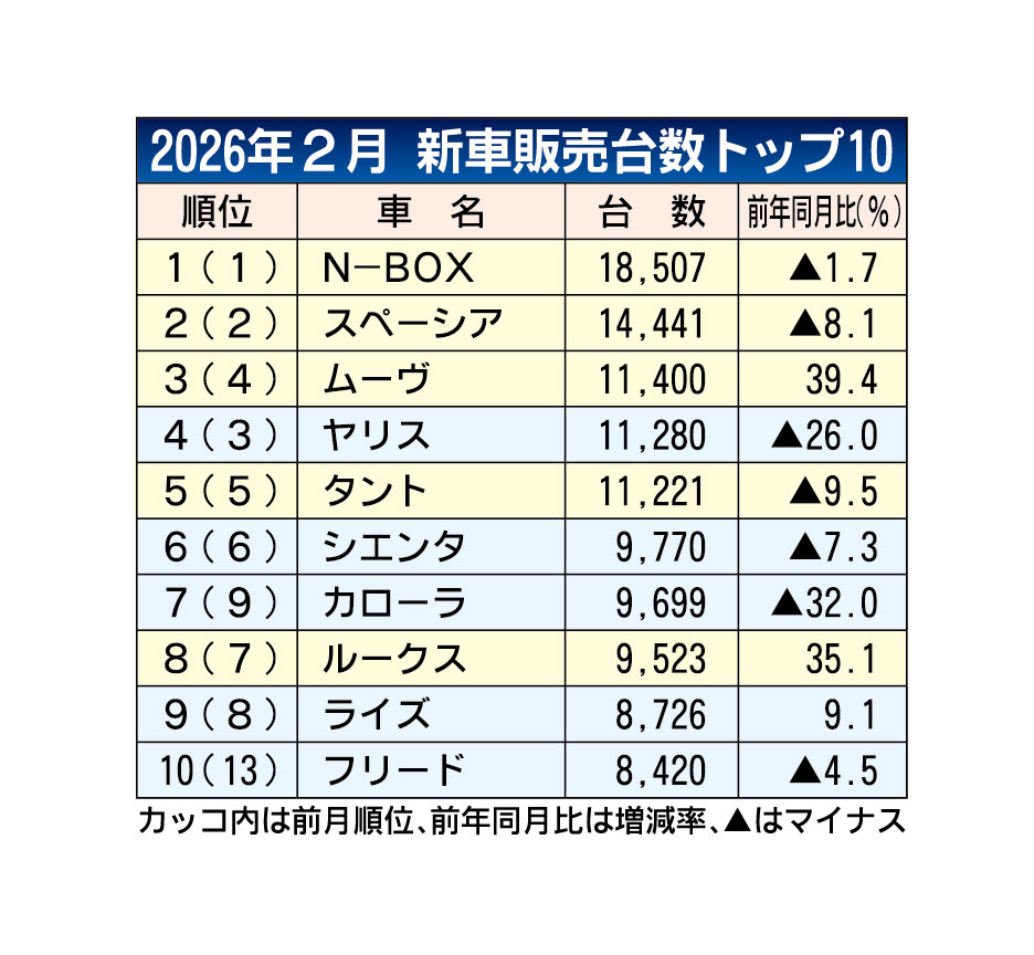 2026年2月の新車販売ランキング、N-BOXが4カ月連続トップ ベスト3は軽が独占