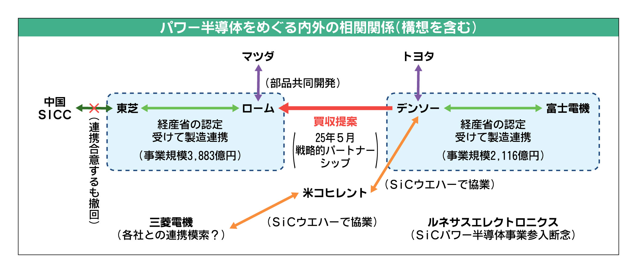 こうしたデンソーの思惑の障害となっていたのがシリコン製パワー半導体に強い東芝グループだ。ロームは東芝が非上場化する際に出資した国内ファンドに3000億円を拠出したほか、パワー半導体の製造でも協業するなど関係が深い。その東芝が昨年8月、SiCウエハーを手掛ける中国の山東天岳先進科技(SICC)と提携すると、中国への技術流出を懸念するロームが強く反発した。これを受けて東芝はSICCとの協業を1カ月後に破棄した。この件でロームとの関係は微妙になっているという。この機に乗じてデンソーはロームを自社の陣営に引き込む戦略とみられる。