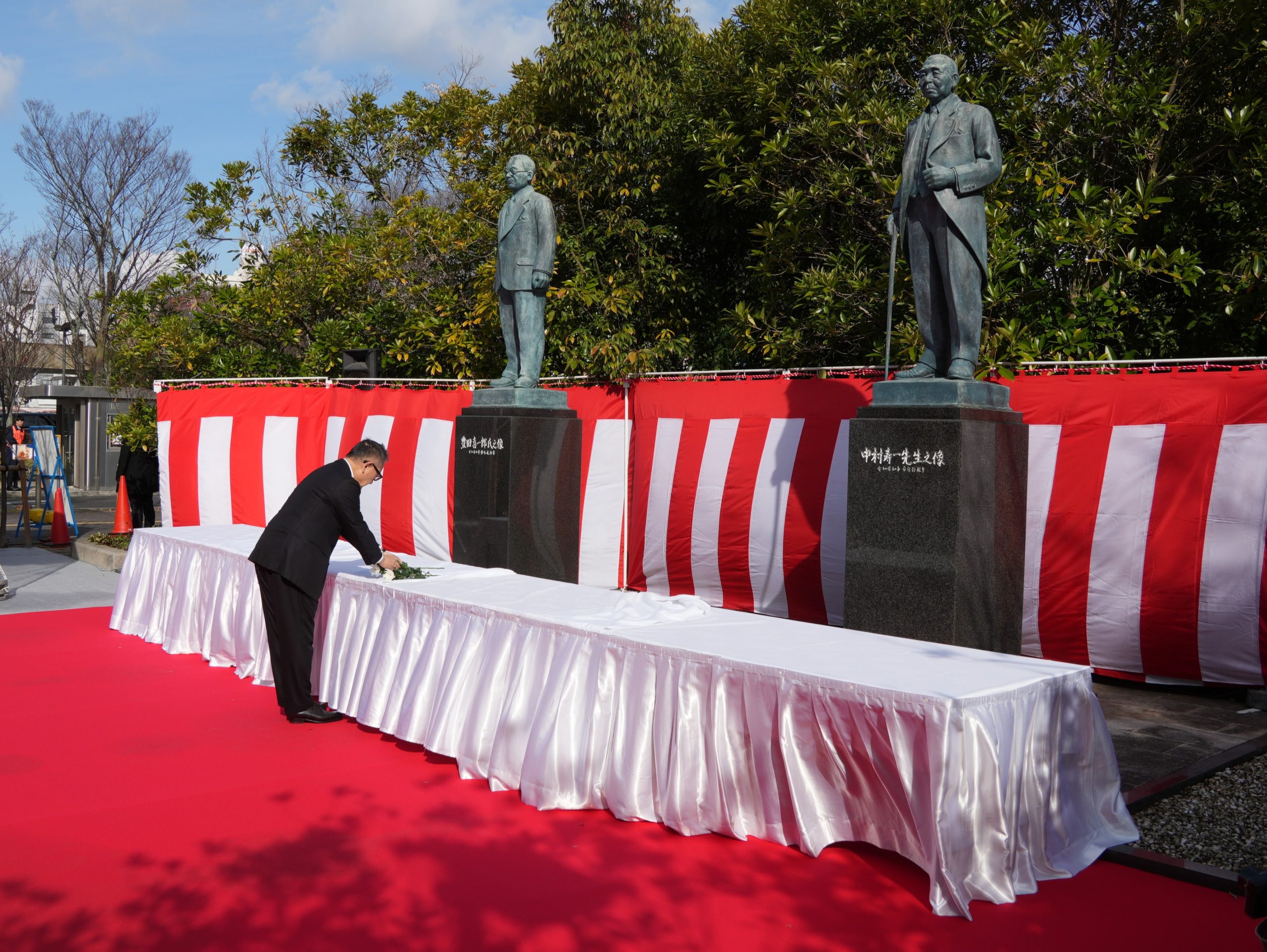 愛知県豊田市が発展する礎を築いた2人の功績をたたえる中村寿一氏・豊田喜一郎顕彰会「献花式」が、豊田市役所で行われた。旧挙母町(現・豊田市)町長だった中村氏と、トヨタ自動車を創業した豊田喜一郎氏を振り返るもの。太田稔彦市長やトヨタ自動車の豊田...