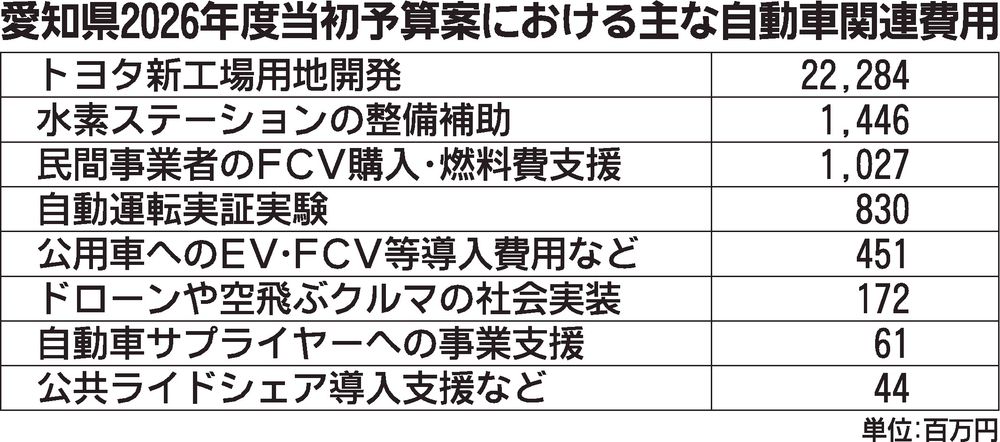 愛知県は2026年度一般会計当初予算案で、自動車・モビリティ関連に263億1800万円を計上した。トヨタ自動車の新工場建設に向けた用地整備に222億8400万円を投じる。さらに、独自の自動運転実証実験に対し、前年度から6割増となる8億3千...
