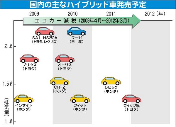 トヨタ自動車、ホンダがハイブリッド車(HV)の国内展開を一段と加速させる。2011年度までの「エコカー減税」をにらみ、ホンダが「フィットHV」の前倒し発売に動くほか、トヨタは「プリウス」より下の「ヴィッツ」級にHVを投入して対抗する。ホン...