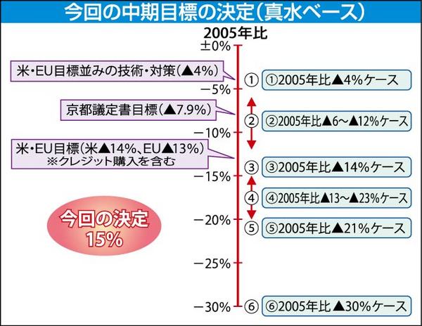 麻生首相は10日、日本の温室効果ガス排出削減についての中期目標を発表した。基準年を2005年とし、20年をめどに05年比15%減(1990年比は8%減)とする目標だ。6月に入り国連気候変動枠組み条約の特別作業部会がドイツ・ボンで開かれるな...