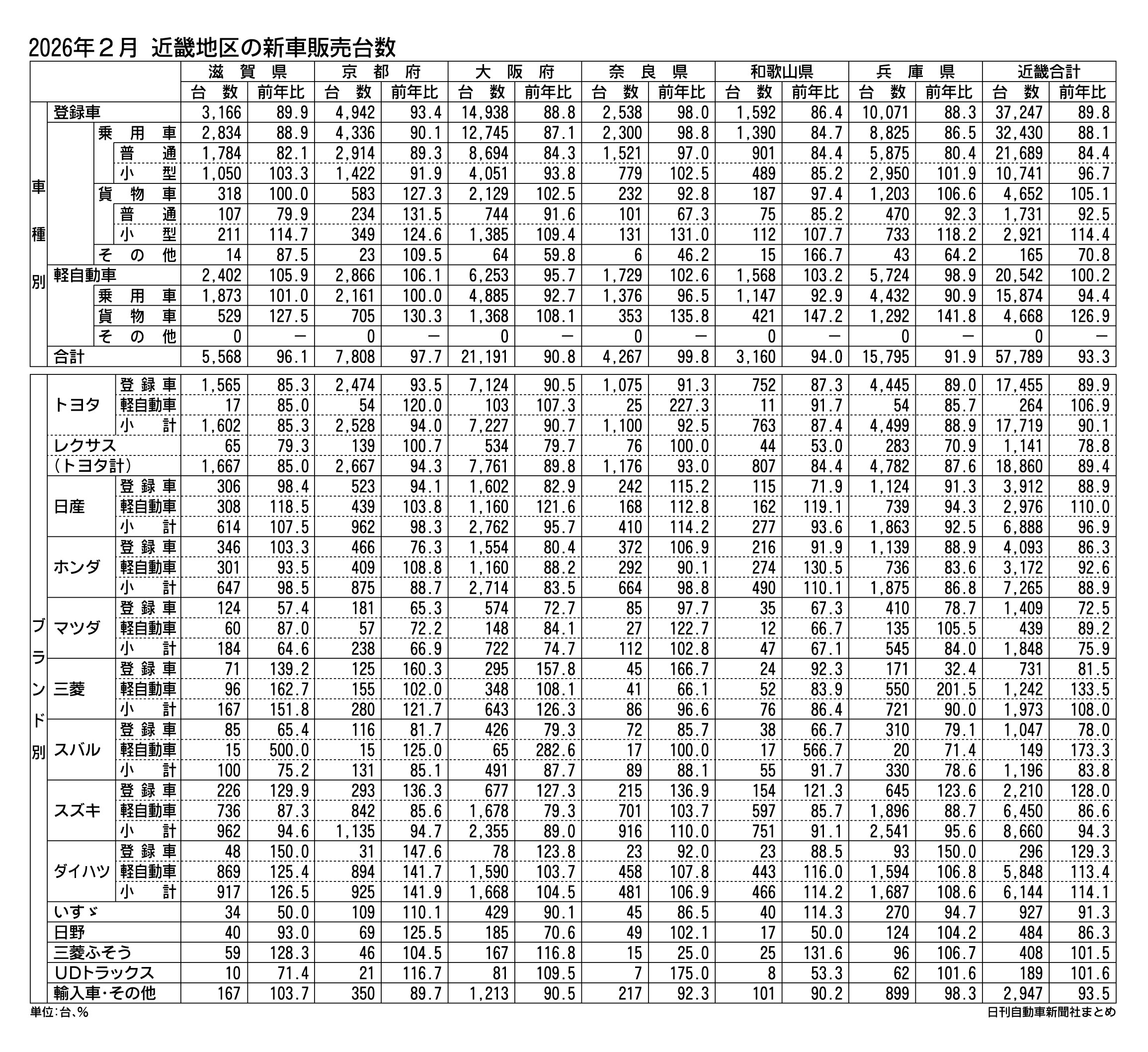 〈2026年2月 近畿地区の新車販売台数〉