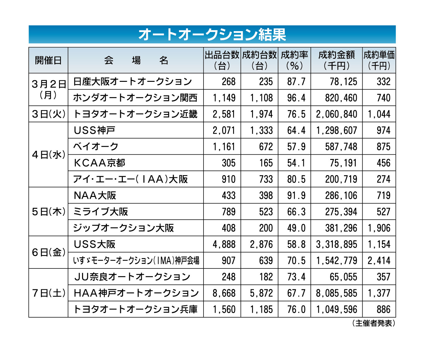 〈オートオークション結果〉近畿地区 2026/3/2~7