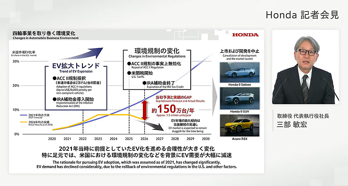 三部社長は「これまで米国での環境規制に向けて対応してきたが、(その分)投資額も大きかった。これに加え米国EV市場は冷え込み、当初想定の半分以下まで市場が縮小している。このまま進めると、さらに収益悪化を招くということで、今回の判断に至った」と説明。一部のEVの開発中止については「ホンダとして、もちろん車を世に出したかった。関わった従業員やサプライヤーなど多大な影響を及ぼしたのは重く受け止めている」とした。