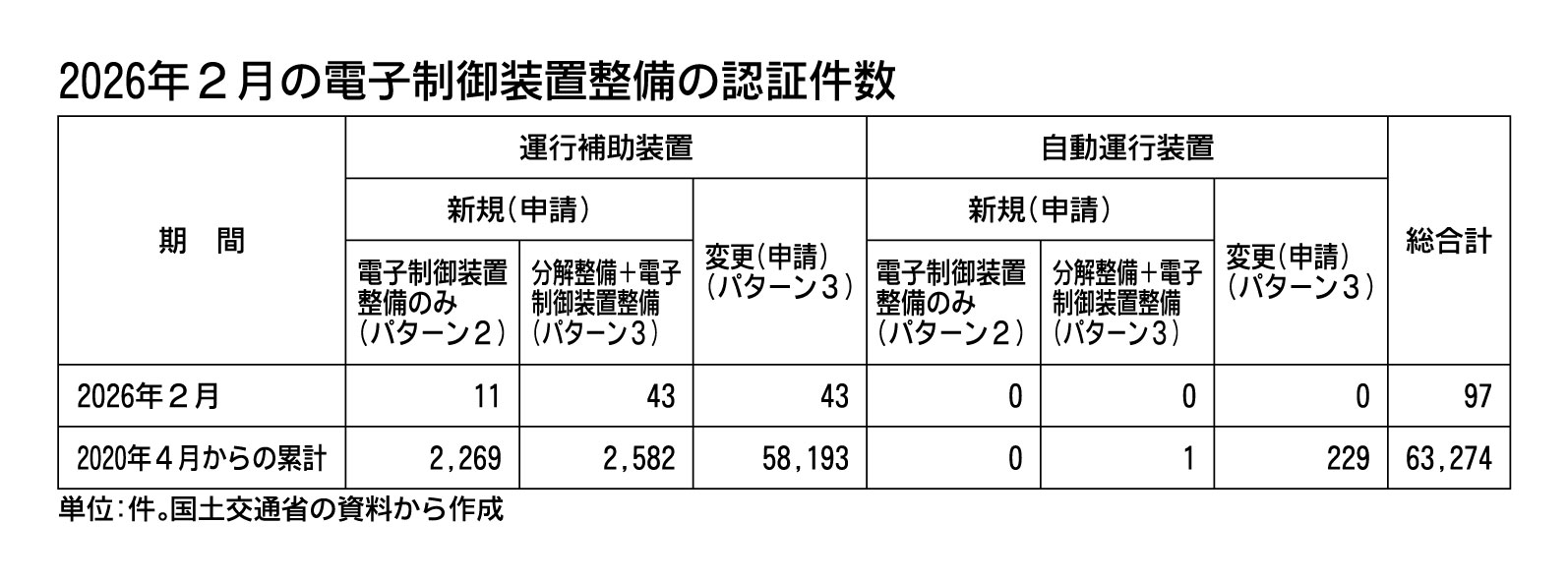国土交通省がまとめた2026年2月の電子制御装置整備の認証件数は97件で、特定整備制度が始まった20年4月からの累計件数は6万3274件(うち自動運行装置230件)となった。パターン別の認証件数は、運行補助装置の新規申請が電子制御装置整備の...