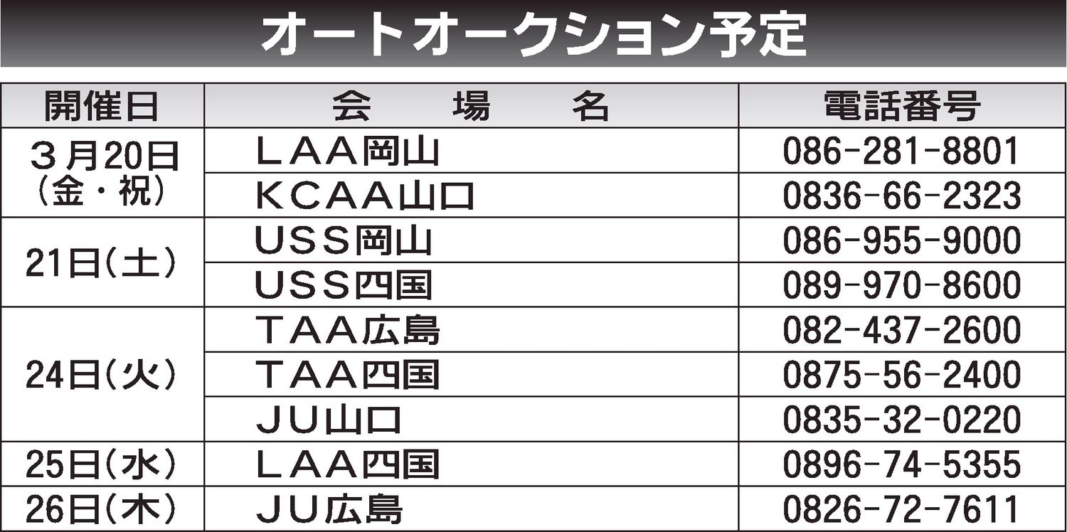 〈オートオークション予定〉中・四国地区 2026/3/20~26