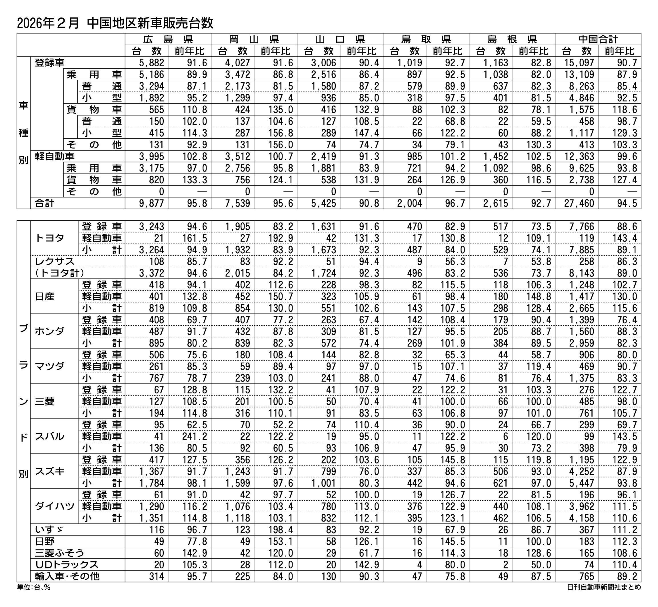 2026年2月の中国地区新車販売台数(登録車と軽自動車の合計)は、前年同月比5.5%減の2万7460台だった。前年割れは2カ月連続で、登録車、軽自動車ともに前年を下回った。下げ幅は全国平均よりも2ポイント大きく、県別でも3カ月ぶりに全県が前...