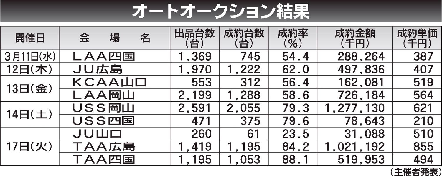 〈オートオークション結果〉中・四国地区 2026/3/11~17