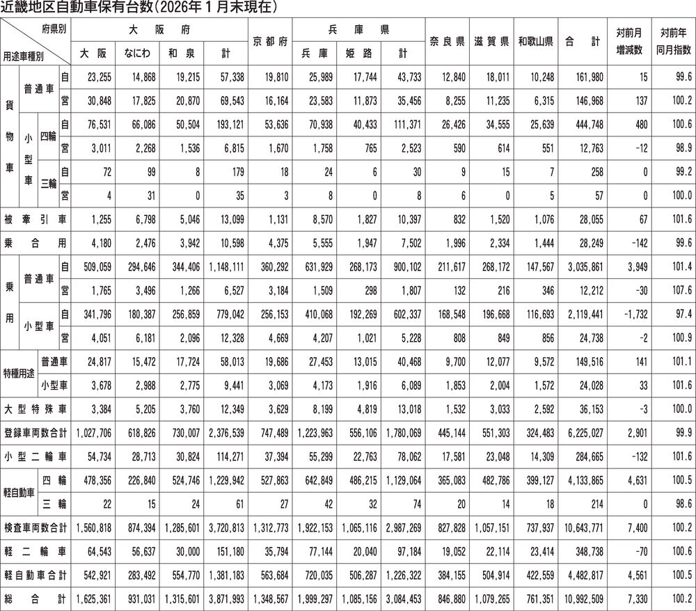 〈近畿地区自動車保有台数(2026年1月末現在)〉