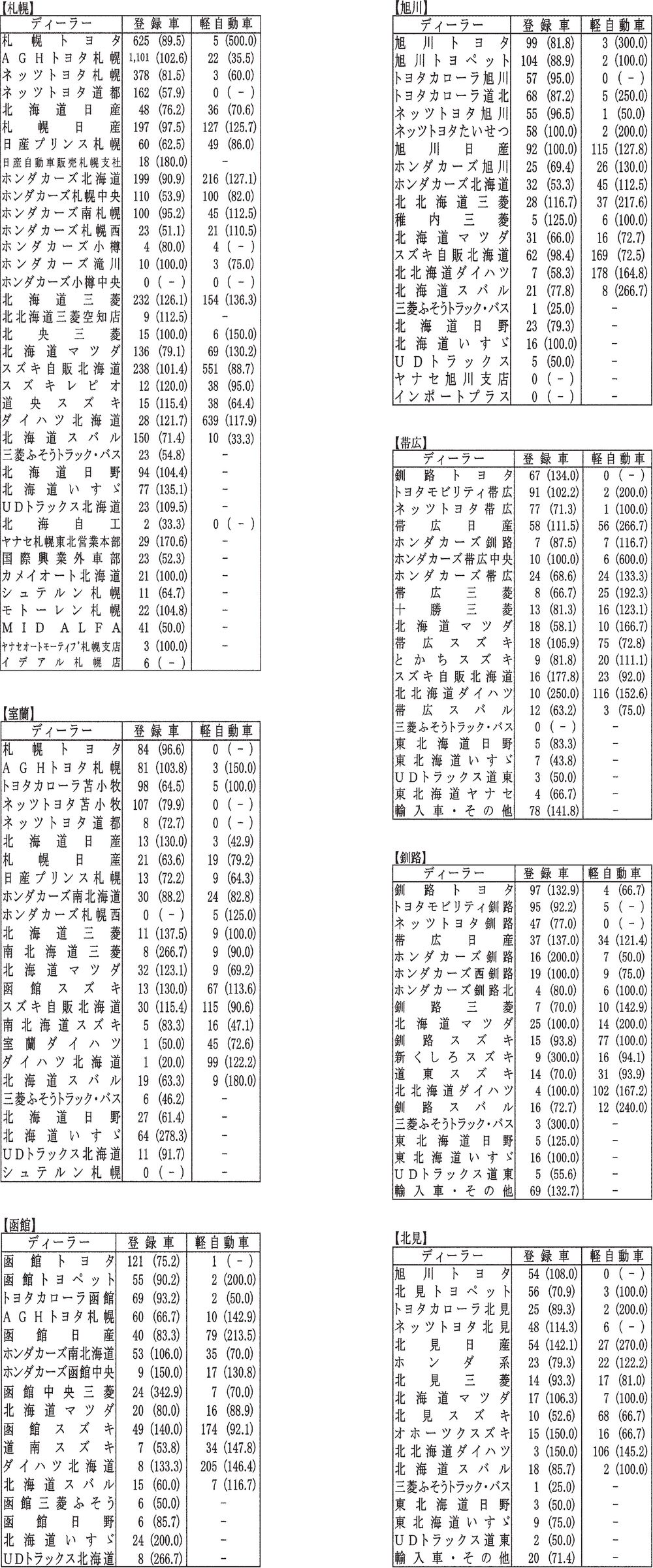 〈2026年2月度全道管内別ディーラー別新車登録・届け出台数(カッコ内は前年同月比)〉※札幌管内ホンダ系・スズキ系の登録台数は自販連正会員分
