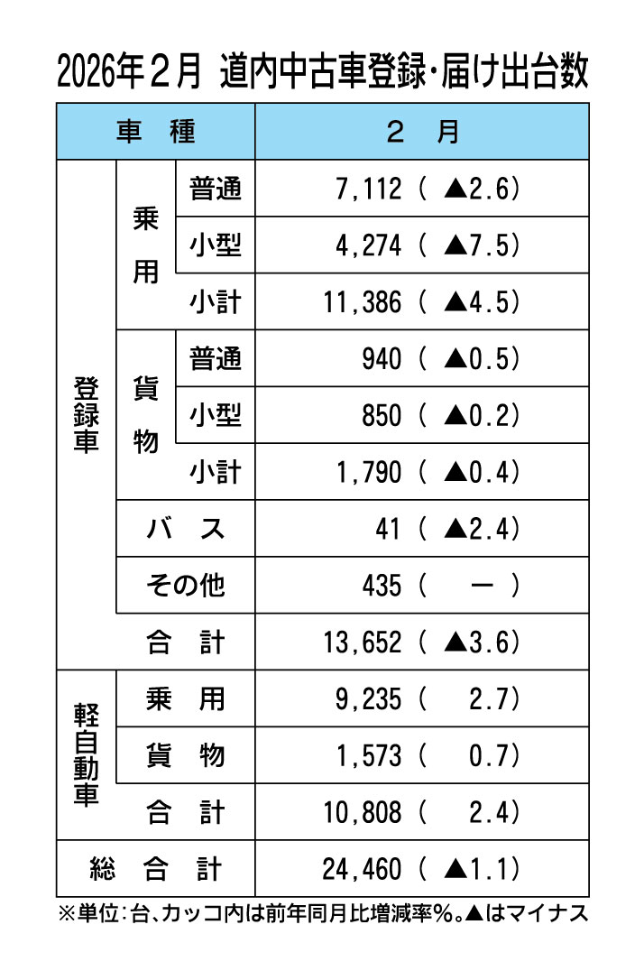 2026年2月の道内中古車登録・届け出台数は、前年同月比1.1%減の2万4460台で、2カ月連続で前年を下回った。軽自動車は同2.4%増の1万808台で2カ月ぶりに前年を上回ったが、登録車が同3.6%減の1万3652台と5カ月連続で落ち込ん...