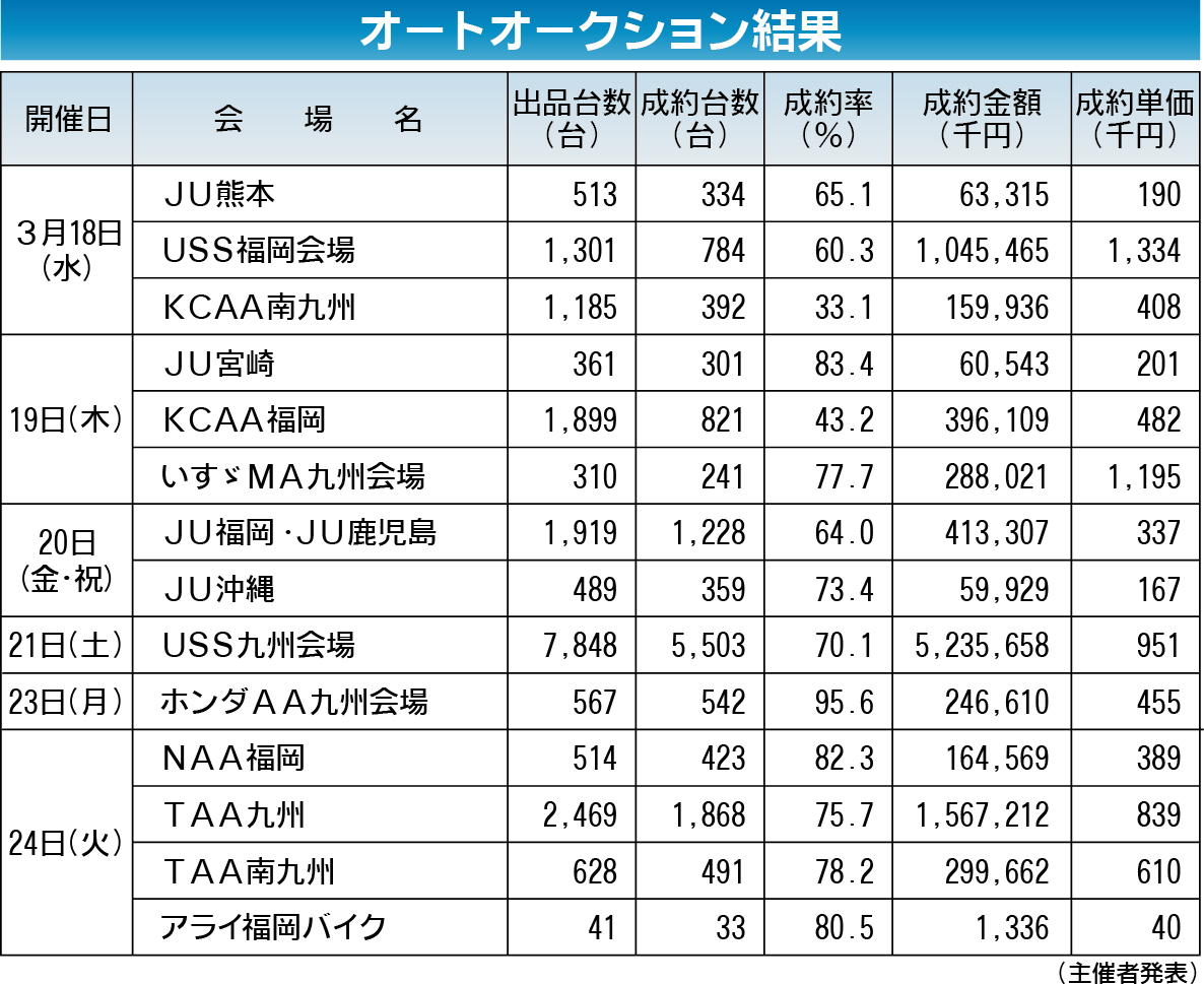〈オートオークション結果〉九州地区 2026/3/18~24