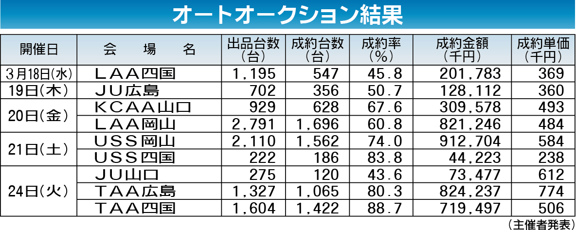 〈オートオークション結果〉中・四国地区 2026/3/18~24