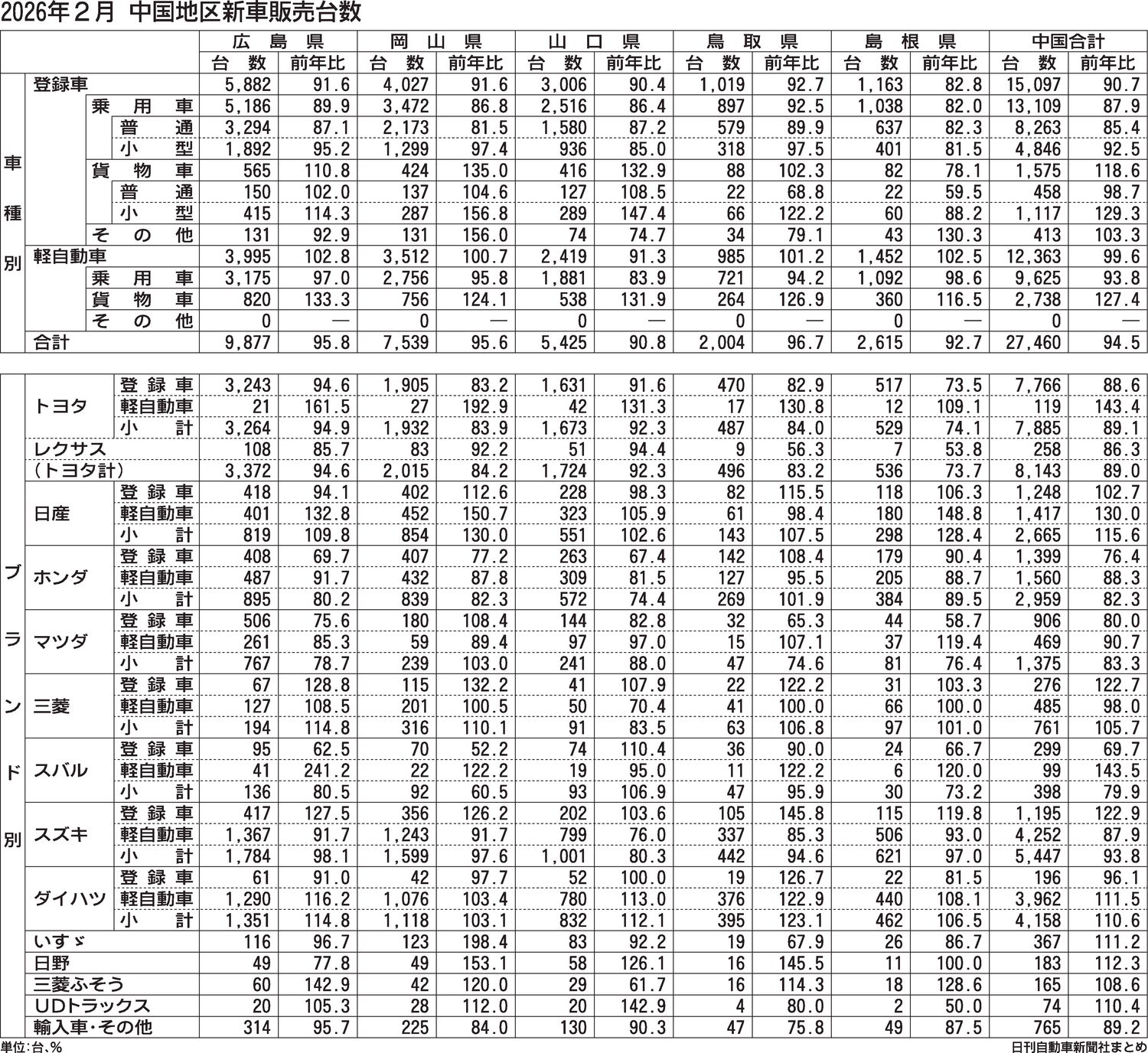 中国地区2026年2月の新車販売台数(登録車と軽自動車の合計)は、前年同月比5.5%減の2万7460台だった。前年割れは2カ月連続で、登録車、軽自動車ともに前年を下回った。下げ幅は全国平均よりも2ポイント大きく、県別でも3カ月ぶりに全県が...