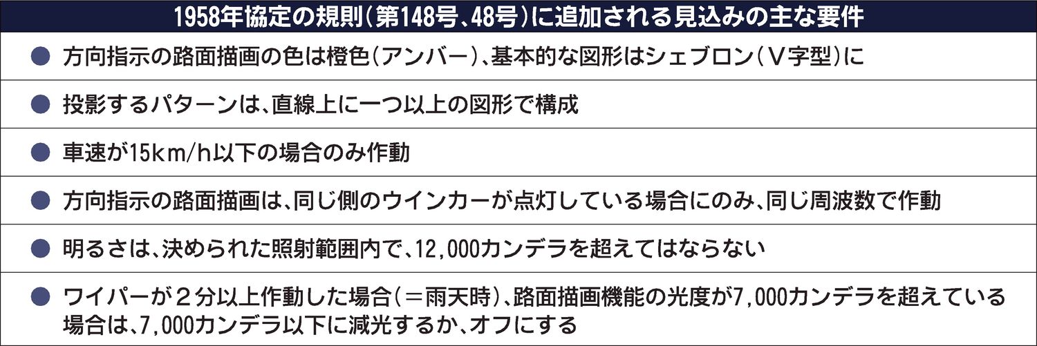 これらの内容は「国連の車両等の型式認定相互承認協定(略称、1958年協定)」に基づく規則(以下、協定規則)の改訂案として、国連の自動車基準調和世界フォーラム(WP29)内で検討されている。WP29の6つの分科会の一つの灯火器分科会(GRE...