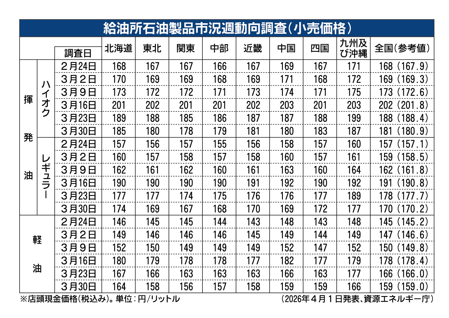 経済産業省が4月1日発表したレギュラーガソリン1リットル当たりの店頭価格(3月30日時点)は、全国平均で前週比7円50銭安の170円20銭だった。イラン情勢の悪化で3月16日に史上最高値(190円80銭)を記録したが、価格高騰対策の補助金が...
