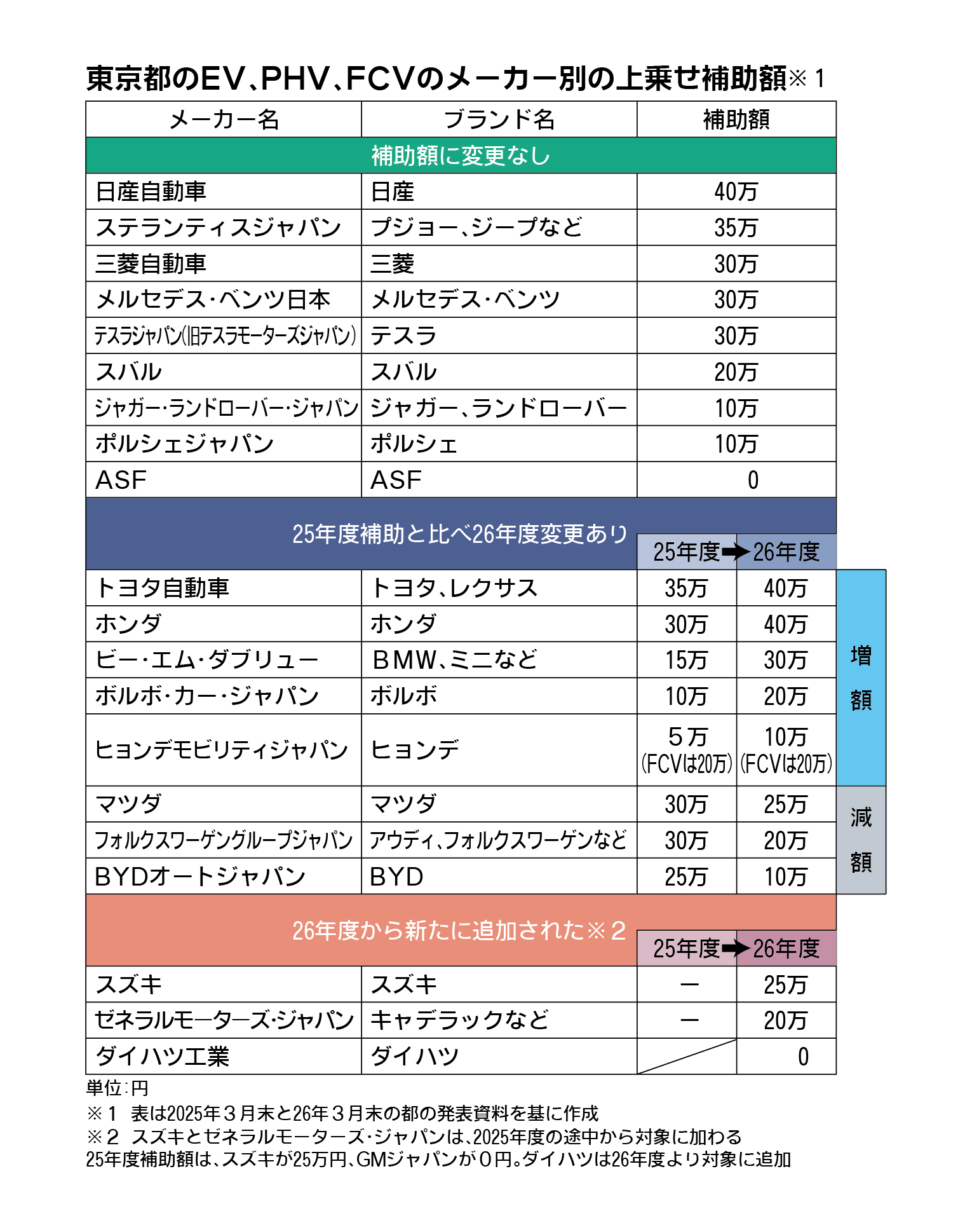 東京都(小池百合子知事)は、ゼロエミッション車(ZEV)の2026年度の購入補助額を公表した。都の補助金は、ベースとなる基本補助額とメーカー別の上乗せ額で構成している。メーカー別の上乗せには、各社のZEVの販売実績などが反映される。日本メー...
