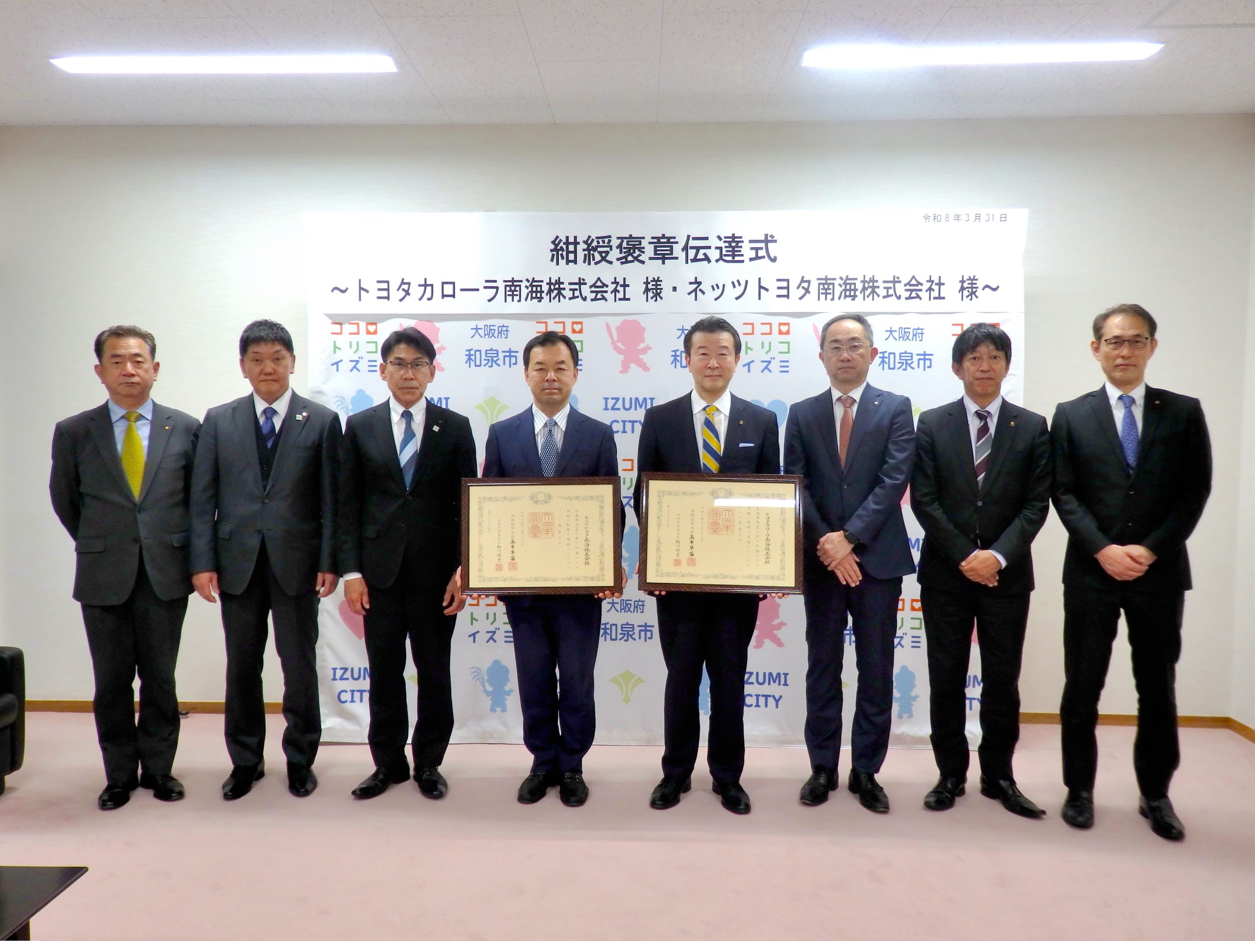 トヨタカローラ南海(久保尚平社長、堺市西区)とネッツトヨタ南海(同)は、大阪府和泉市に対して1500万円ずつを寄付したことで、紺綬褒章を受章した。企業版ふるさと納税を活用し、2024年11月に寄付した。合計3000万円の寄付金は、「和泉市久...