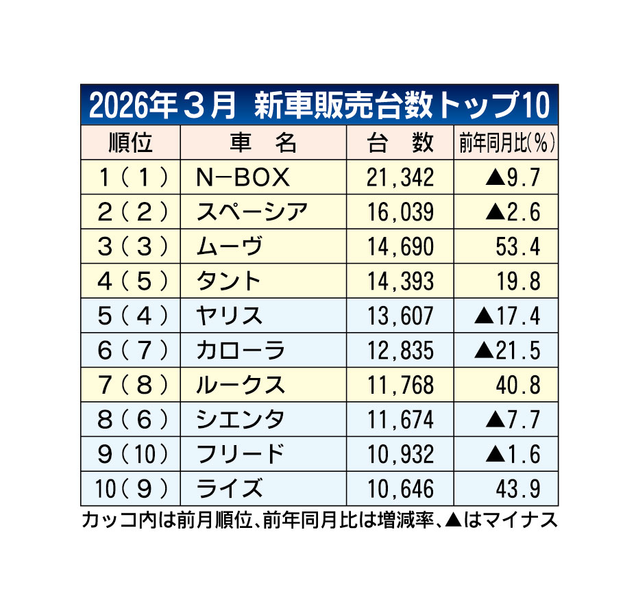 〈2026年3月の車名別販売台数〉