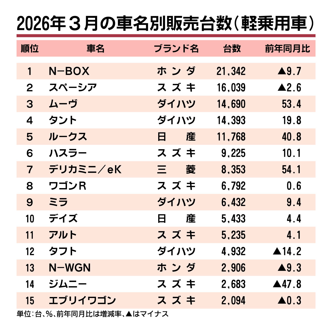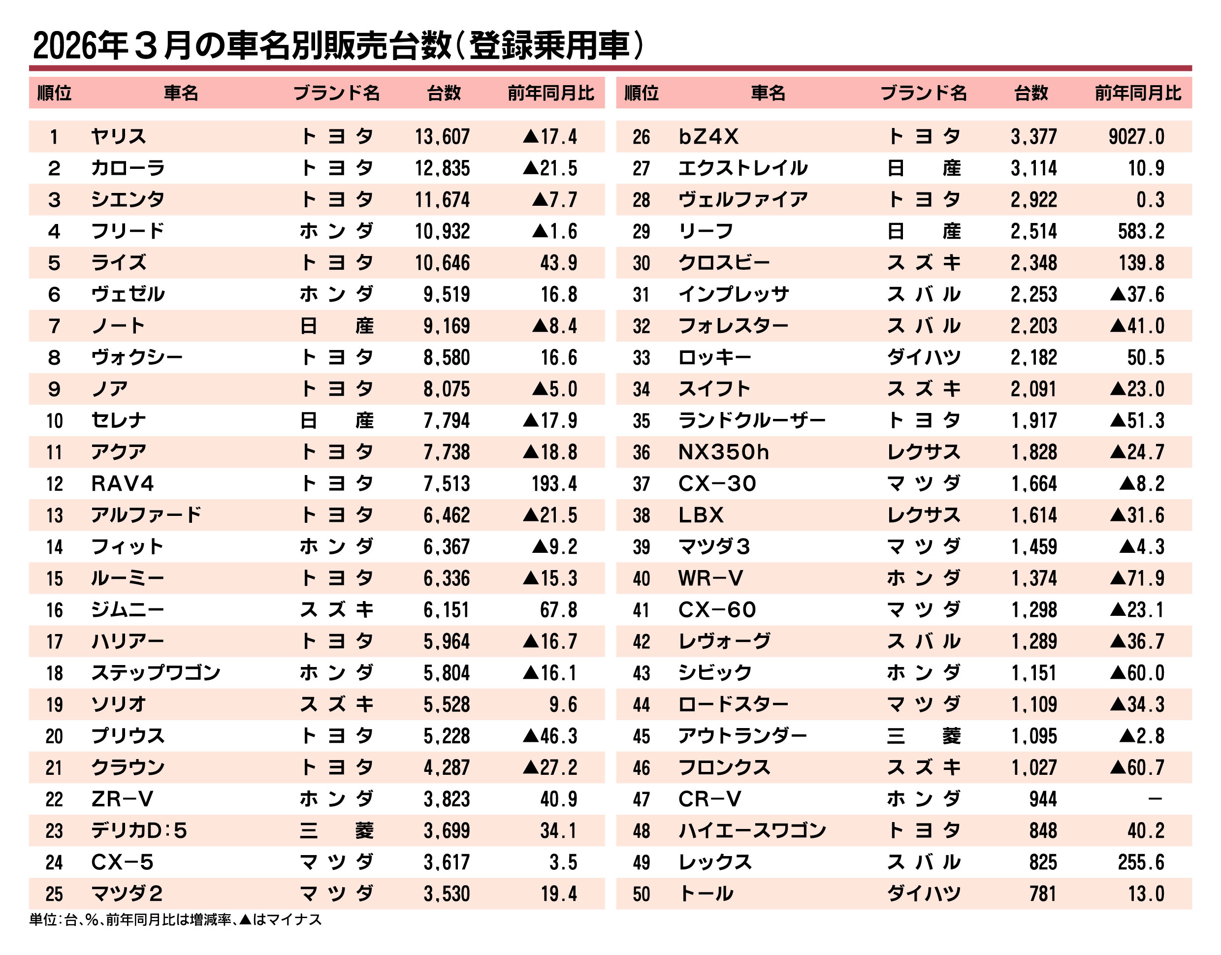 〈2026年3月の車名別販売台数〉