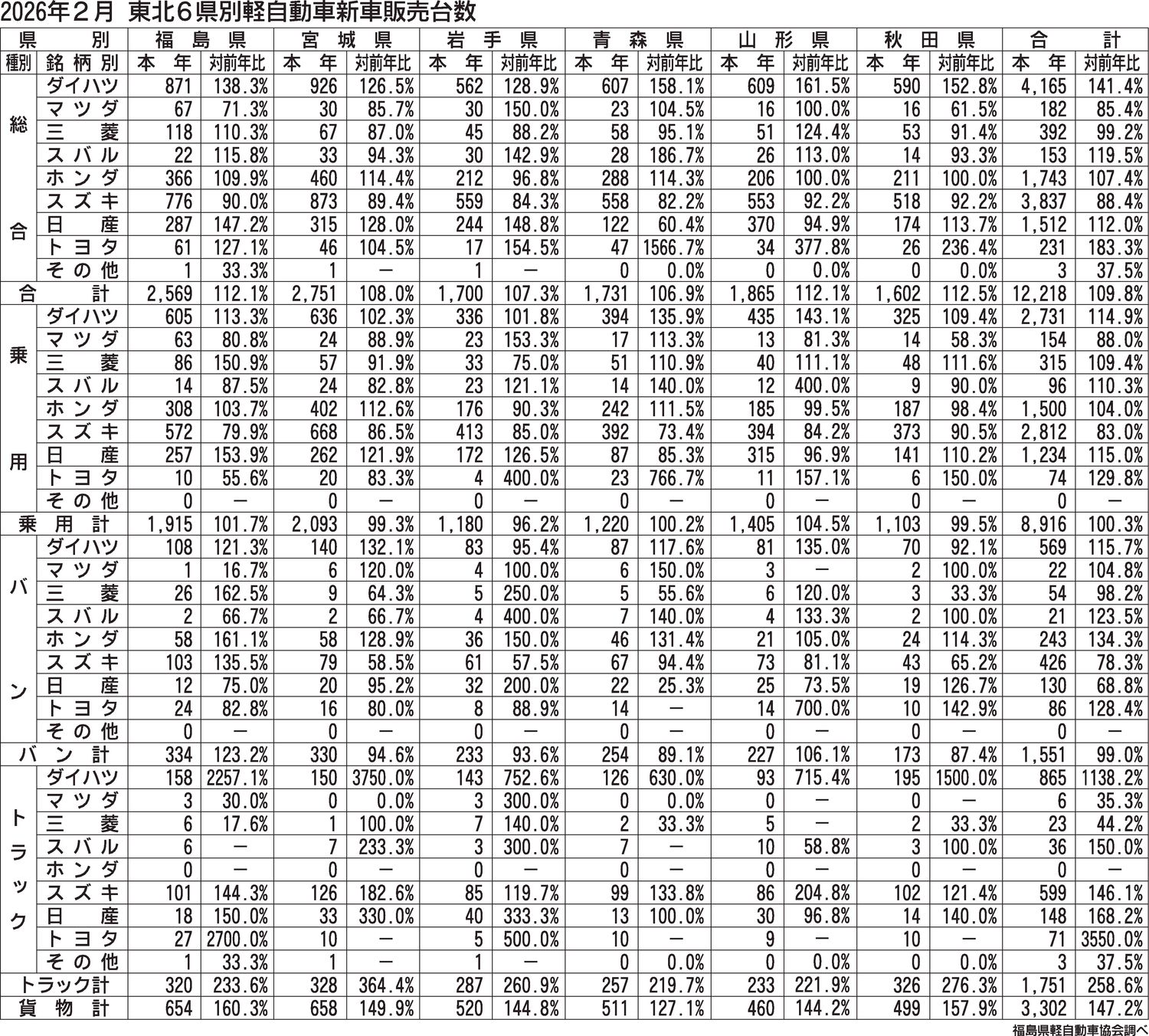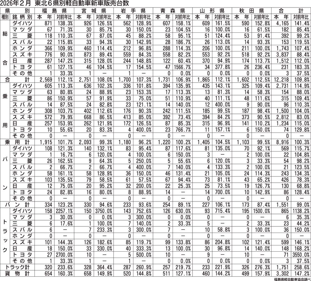 〈2026年2月 東北6県別軽自動車新車販売台数〉