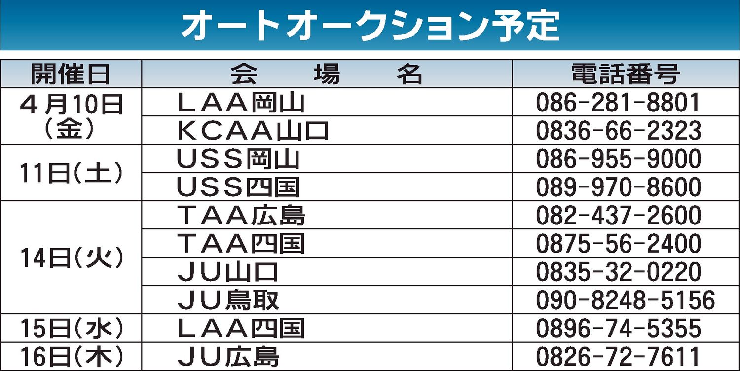 〈オートオークション予定〉中・四国地区 2026/4/10~16