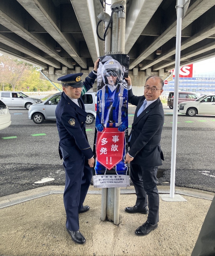 あいおいニッセイ同和損害保険新潟支店(鈴木裕一郎支店長、新潟市中央区)は、新潟県警察本部へ交通事故防止用電柱幕「交差点ポリス」を寄贈した。同社は昨年11月に新潟県警察と包括連携協定を締結し、新潟県の交通安全課題に取り組んでいる。寄贈した電柱...