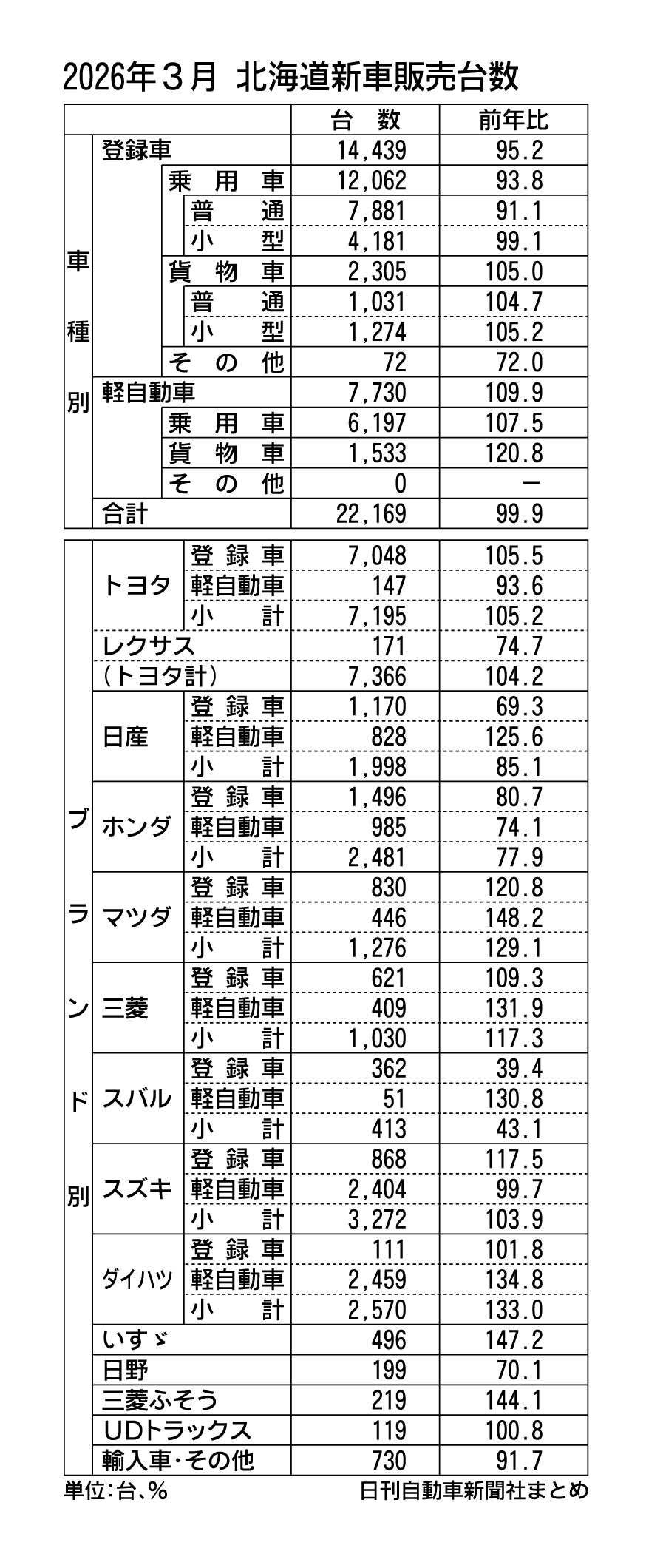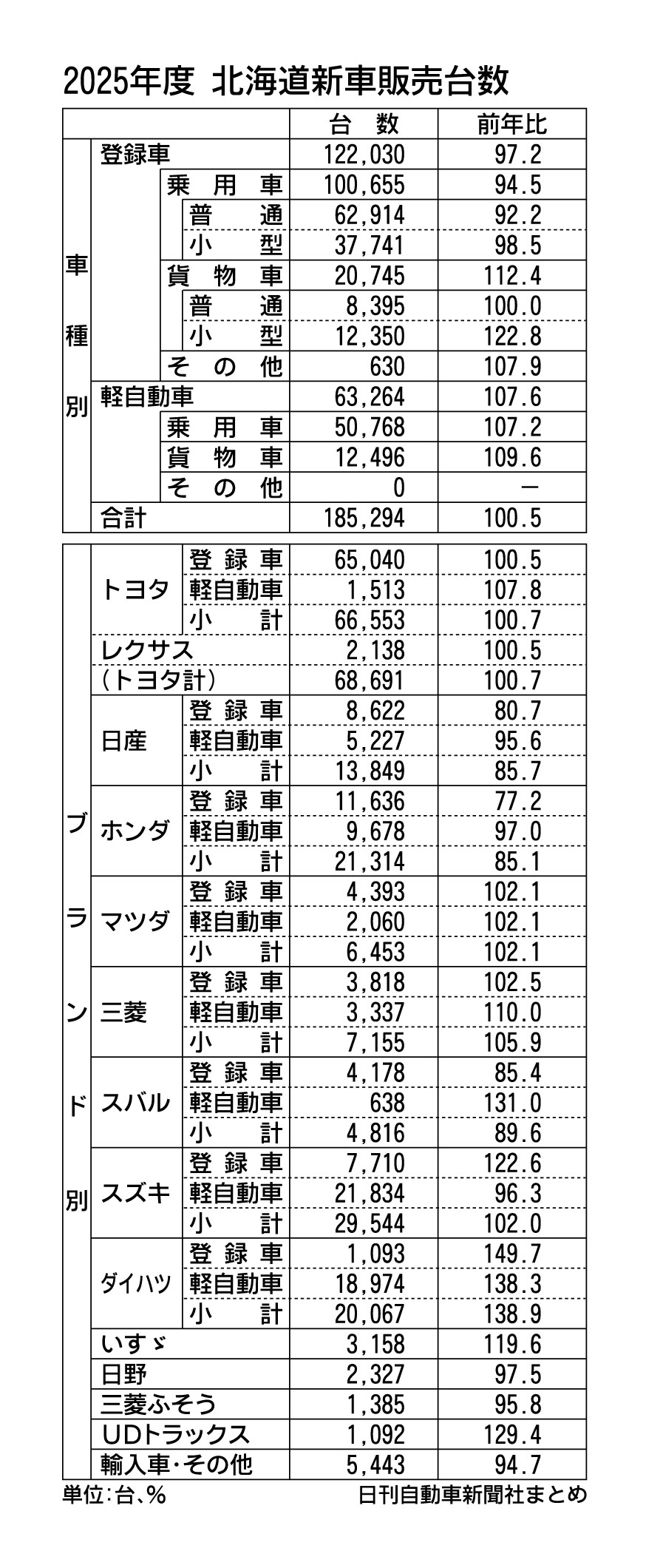 2025年度(25年4月~26年3月)の道内新車販売台数(登録車と軽自動車の合計)は、前年度比0.5%増の18万5294台で、2年ぶりのプラスとなった。登録車は一部車種の供給制約などで2年連続の前年割れだが、軽自動車が2年ぶりのプラスを確保...